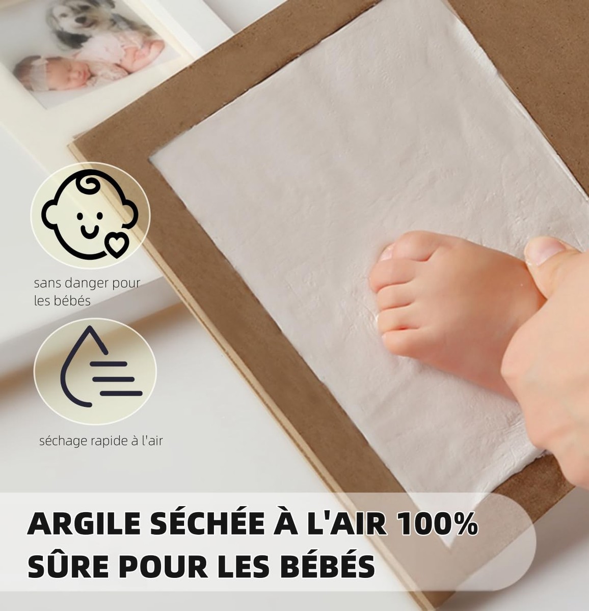 Le colis comprend : Cadre empreinte enfant Argile blanche de 250 g Rouleau à pâtisserie Ruban adhésif double face de 1 mètre Mode d'emploi en italien Notre entreprise vise à offrir à nos clients des produits de la plus haute qualité. Bientôt la vente sera disponible dans toute l'Europe. S'il vous plaît noter: Assurez-vous de laver la main et le pied de votre petit peu après. Nous serons très reconnaissants et honorés, si vous faites partie de notre clientèle aussi. Créez un souvenir durable dans le temps - Créez le souvenir des empreintes des mains et des pieds de votre enfant avec ce kit porte-photo. Mettez la photo de votre bébé à côté des empreintes d'argile et rendez votre baby art unique en gardant pour toujours ce souvenir qu'il ne s'estompera jamais ✅ Garanti - Adressez à notre assistance si vous avez des problèmes, des doutes ou des questions. Étape 2 : Insérez l'argile dans le cadre et utilisez un rouleau à pâtisserie ou une tasse pour créer une surface lisse et plane. Description du produit Parmi les meilleures marques MaCla est une nouvelle entreprise italienne, fondée par un groupe de jeunes garçons. Kit Empreintes Mains Pieds Argile Kit Empreintes Mains Et Pieds Bébé Avec Cadre Photo | Idée Cadeau Empreintes Bébé Nature Et Découverte Un kit d'empreintes pour mains et pieds : Capturez les empreintes adorables des petites mains et pieds de votre bébé grâce à notre kit d’empreintes réutilisable 5 à 6 fois et sans danger pour la peau de bébé. Nous voudrions effectuer une description ici mais le site... Complétez le tableau avec une adorable photo de votre enfant avec son chien ou chat bien-aimé Facile à utiliser – Étendez la pâte à modeler non toxique et certifiée sgs de notre kit empreintes bébé avec le rouleau à pâtisserie fourni dans la livraison et créez l'empreinte ; une fois la forme désirée obtenue, laissez-la solidifier complètement. Nous garantissons la qualité du produit, l'équipe Macla a fait tout pour garantir aux clients un excellent achat Effectuez toutes les étapes afin d'éviter les imperfections dans l'empreinte de bébé Nous répondons dans les 24 heures suivant votre demande Créez des décorations uniques avec les empreintes des mains et des En plus vous aurez 1 mètre de ruban adhésif double face pour coller les photos dans le cadre entièrement offert Votre enfant est tout simplement parfait Nous veillons à ce que son empreinte soit aussi Créer votre cadre avec empreinte enfant est facile et amusant ! Étape 1 : Retirez l'argile de l'emballage et manipulez pendant 3 à 5 minutes jusqu'à la rendre douce. Nos anges grandissent si vite Avez-vous déjà demandé comment garder le souvenir de tous ces moments spéciaux ? Le kit d'empreintes MaCla est le moyen idéal pour préserver ces moments précieux.