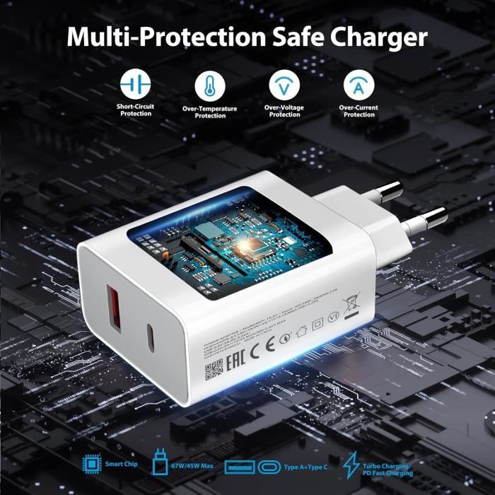 Le câble USB C de 1., 5 mètres offre une grande liberté d’utilisation au quotidien sans contrainte de distance. Chargeur Sécurité Multiple 67W TURBOCHARGE Chargeur Pour Original Xiaomi 2M USB C Câble De Charge Adaptateur Secteur Pour Xiaomi Redmi Note 13 12 11 10 9 Poco M6 M5 X6 X5 X4 X3 Mi14 Mi13T Câble 6A 1.5m Chargeur USB C 67W Rapide avec câble 1., 5M – Compatible HyperCharge Xiaomi Ce chargeur rapide est conçu pour offrir des performances de charge exceptionnelles à vos appareils Xiaomi, Redmi et POCO. La technologie de charge super rapide de notre prise USB détecte automatiquement les appareils connectés, identifie les besoins de charge spécifiques de l'appareil et ajuste la tension pour fournir la charge la plus rapide possible, Utilisez cet adaptateur de chargeur et ce câble pour charger xiaomi 14t à 80% en 30 minutes.Charge rapide et... Technologie de câble 6A : Inclus un câble USB Type C de 1., 5 mètres supportant jusqu'à 6A pour une efficacité de charge maximale. L'association parfaite avec l’adaptateur 67W garantit une recharge rapide, stable et sécurisée à tout moment. Parfait pour tous les modèles Xiaomi/Redmi/Poco récents. Le câble USB-C inclus supporte même le transfert de données à 480 Mbps. Et pas d'inquiétude pour la... Design compact pour une portabilité maximale. Ce chargeur couvre une large gamme de modèles pour s’adapter à tous vos besoins. Sécurité intelligente intégrée : Système de protection multiple contre la surtension, surintensité, surchauffe et courts-circuits. Chargeur Xiaomi 67W Turbo Rapide (Câble USB-C 1m) pour Séries Sécurité et fiabilité garanties Protection contre les surtensions, la surchauffe et les courts-circuits. Design compact et pratique : Léger et facilement transportable, ce chargeur est idéal pour les déplacements, le bureau ou la maison.