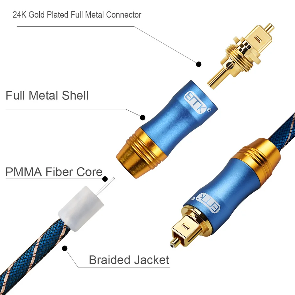 Les capuchons de protection inclus évitent la poussière et l’oxydation lors du stockage ou du transport. Idéal pour les systèmes Home Cinéma, il assure une qualité sonore professionnelle sur tous vos équipements Il permet de connecter facilement vos appareils sans plier le câble, même dans des espaces étroits, assurant une liaison stable et une protection durable du cordon fibre optique L’alliage d’aluminium renforce la solidité du câble et préserve la pureté du signal. EMK Câble audio optique Câble audio optique Câble Toslink Câble Spdif 🎯 Pourquoi choisir ce câble optique audio? Connecteur rotatif 90°/360° pour espaces réduits Transmission lumineuse sans interférence Double blindage et nylon tressé résistant Compatibilité Toslink/SPDIF universelle Qualité audio haute fidélité certifiée Grâce à sa gaine en nylon tressé, il résiste à plus de 10 000 flexions, assurant une utilisation longue durée 🛡️Sturdy and safe: Les connecteurs plaqués or 24K assurent un contact stable et une protection efficace contre la corrosion. 10m Câble Optique Audio Numérique Cordon Fibre Optique Toslink pour... Sa flexibilité exceptionnelle le rend parfait pour les installations fréquemment sollicitées. Nom du produit: Câble Optique Audio Numérique Toslink 90° & 360°, 1 Mètre Longueur: 1 mètre Matériaux: Nylon tressé, alliage d’aluminium, connecteurs plaqués or 24K Contenu du set: 1 × Câble fibre optique avec connecteurs rotatifs + 2 capuchons antipoussière 🔄 Conception intelligente et flexible: Le câble optique 90° et 360° rotatif s’adapte facilement à toutes les configurations, même derrière les téléviseurs fixés au mur. Design pivotant 90° et 360°: Ce câble optique audio innovant intègre un connecteur rotatif à 360° et un embout coudé à 90°, idéal pour les installations murales. Câble Audio Optique Toslink VoluPack® 30M Câble Optique Audio Numérique Nylon Tressé Cordon Fibre Transmission Audio Haute Fidélité Cable Optique Câble Optique (Coquille Fibre De Carbone) Audio Numérique... Connecteurs plaqués or 24K et capuchons de protection: Les connecteurs plaqués or 24 carats assurent une conductivité optimale et une résistance à la corrosion sur le long terme.