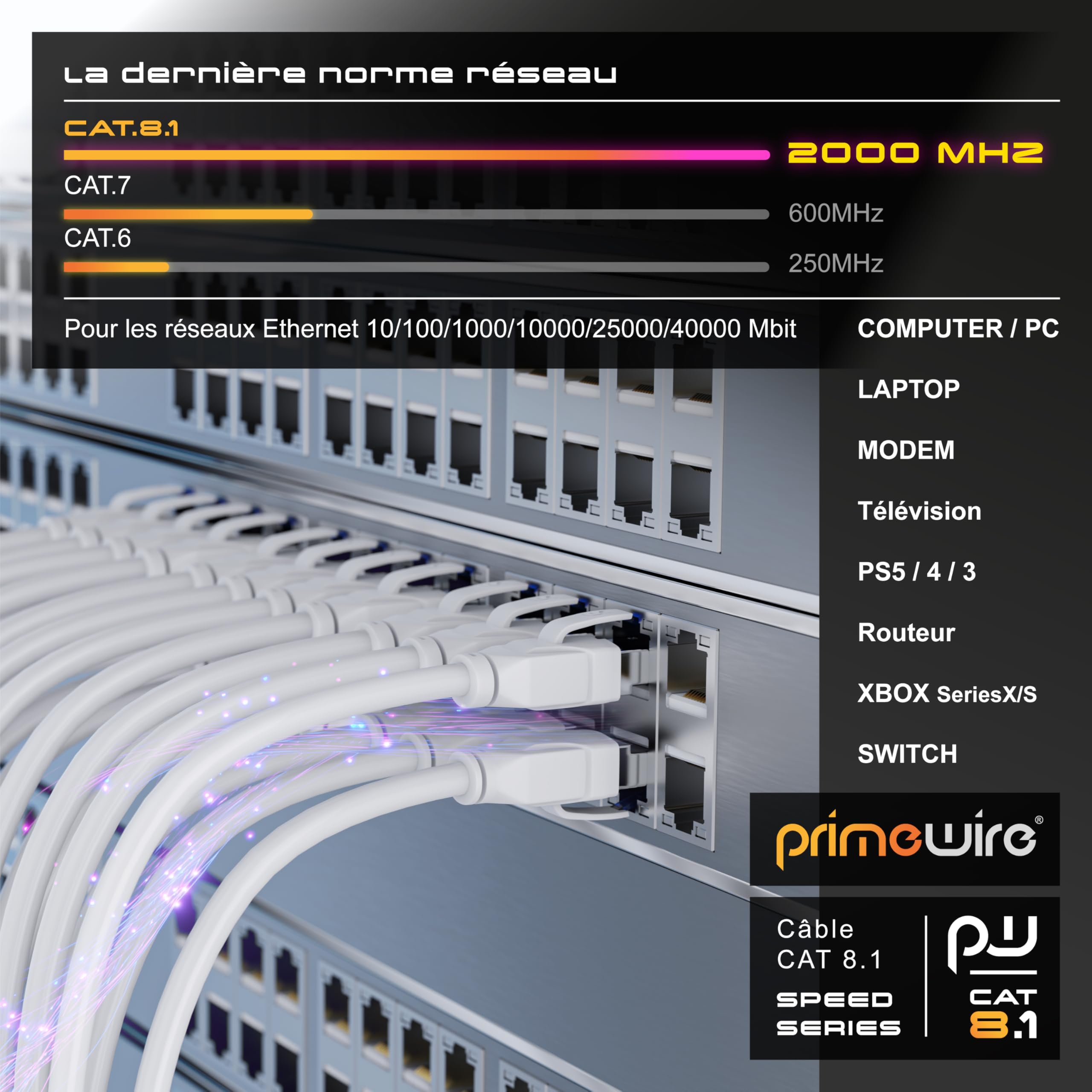 Idéal pour les réseaux Ethernet 10/ 100/ 1000/ 10000/ 25000/ 40000 Mbit/s. Numéro de produit : 304036 Caractéristiques : Double blindage feuillard (1) avec des fils à paires torsadées (2), des conducteurs internes multibrins en cuivre de haute qualité (3), un levier de verrouillage (4) et une Gaine anti-pliage (5) Dotées également d’un couvercle anti-pliage et un levier de verrouillage. Contenu de la livraison : câble CAT., 8., 1 avec 2 connecteurs RJ45., (Une garantie de 24 mois et un service après-vente à votre écoute). 4 paires de boucliers dans un seul compact. Caractéristiques du produit : Câble patch : câble CAT., 8., 1 avec 2 x fiches RJ-45 (8., 1, classe 1) Equipez votre réseau avec les nouveaux Câbles CAT 8., 1 et ayez une vitesse de transmission allant jusqu'à 40 Gbit/s Le câble Ethernet de raccordement Primewire, peut être utilisé pour n'importe quelle vitesse DSL et peut connecter tous les appareils réseau. Câble Ethernet Cat 7 Câble Réseau 10Gbps avec 650 MHz Fiches RJ45 U-FTP... Compatibilité : convient aux PC, laptop, modems, routeurs DSL, commutateurs, caméras réseau, imprimantes réseau, serveurs, consoles de jeux, Playstasion 5 PS5, Microsoft Xbox series X et S, Smart TV, lecteurs multimédia, amplificateurs surround, radios Internet, etc. Connecteurs : le câble et les fiches RJ45 forment une unité continue blindée. Vitesse de transmission : La norme CAT 8., 1 classe 1 calcule et minimise les interférences la diaphonie générée par une fiche RJ45., Donc, la norme CAT8 avec la fiche RJ45 peut atteindre une vitesse de transmission allant jusqu’à 40 Gbit/s avec une bande passante de 2000Mhz Cable Ethernet 5m, Cable Rj45 Cat 6 Câble Réseau 5m Plat Haut Débit 1Gbit-s Cat 6 Câble Ethernet Blindage : 4 paires de câbles en cuivre torsadés blindage feuillard (S/FTP, PiMF) Le câble a 4 paires de fils en cuivre torsadé à double blindage (S/FTP). Il est flexible et dimensionnellement compact, donc c’est le premier choix pour une installation facile. Haut Débit : la norme CAT 8., 1 classe 1 calcule et minimise les interférences et la diaphonie générée par une fiche RJ45., Donc, la norme CAT8 avec les fiches RJ45 peut atteindre une vitesse de transmission allant jusqu’à 40000 Mbit/s et une bande passante de 2Ghz supérieure à celle des catégories 5 et 6., Double blindage feuillard S/FTP : avec des fils à paires torsadées et des conducteurs internes multibrins en cuivre de haute qualité. Modèle : câble réseau Primewire CAT 8., 1 de 0,5m (catégorie 8., 1, classe 1), vitesse de transmission allant jusqu'à 40 Gbps, Bande passante de 2Ghz. CSL Câble réseau CAT.8 15 40 Gbits – Câble réseau LAN – Câble... Cable Rj45 50 Cm 0,5M - Câble Réseau Cat.7 5 Pièces Jaunes Câble Lan Ethernet Gigabit 10000 Mbit S Câble Patch Cable Ethernet Cat 8 Prix Isolation sans halogène Isolation sans halogène. Il convient parfaitement aux réseaux Ethernet 10/ 100/ 1000/ 10000/ 25000/ 40000 Mbit/s.