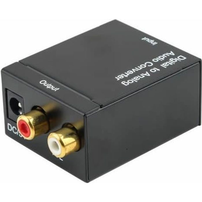 1 Assurez-vous que le type d'entrée correct est sélectionné. Le DAC02 est un puissant adaptateur audio numérique analogique qui transforme les signaux audio numériques coaxiaux / optiques TOSLink en analogique, pour à un système de son externe. Rapport signal bruit : 100dB Réglage du volume Bouton volume facile à utiliser pour régler le volume de sortie des prises RCA et AUX. Récepteurs AV et amplificateurs intégrés Dolby, DTS et autres formats numériques compressés non supportés (prise charge des appareils supportant le format audio PCM / LPCM) Récepteurs satellite / câble et DVR, TiVO Ce petit appareil est tout ce dont vous aurez besoin pour relier votre système audio avec une large gamme de sources numériques, notamment des lecteurs de DVD, la TVHD de jeu populaires., Usage recommandé: 1., Prend en charge tous les périphériques dotés de ports audio numériques optiques ou coaxiaux suivants: Télévisions numériques et HD ; lecteurs CD, DVD, Blu-Ray et HD-DVD Non compatible avec les écouteurs professionnels ou à haute impédance (supérieure à 32Ω), tels que Audio-Technica, Ultrasone, Sennheiser. Lecteurs multimédias numériques et streamers, 2., Fonctionne avec des écouteurs CLASSIQUES (impedance inférieure à 32Ω) 3., Fonctionne avec des enceintes ACTIVES avec amplificateur intégré. Avantree DAC02 DAC Convertisseur Optique RCA, Nuérique Vers Analogique Adaptateur Audio avec... Fonctionnement simultané sur casque et enceintes Grâce à notre appareil, utilisez votrecasque audio et vos enceintes en même temps! Large compatibilité Notre appareil fonctionne parfaitement avec tous les équipements dotés de ports numériques, optiques ou coaxiaux, téléviseurs haute définition, récepteurs satellite, systèmes home cinéma, lecteurs DVD, Apple TV, amplificateurs AV ainsi qu'avec des consoles de jeu (PS3, PS4 et Xbox, etc., ). Usage inadapté / non recommandé: Ne peut pas être utilisé comme adaptateur VIDEO Ne fonctionne pas avec les enceintes PASSIVES Ne fonctionne pas avec les casques sans-fil Bluetooth Extracteur audio HDI 4K x 2K, adaptateur convertisseur audio HDI vers HDI prend en charge la Veuillez régler le format audio de votre téléviseur sur PCM / LPCM., 3., Assurez-vous que le réglage de la SORTIE audio de votre téléviseur soit positionné à Haut-parleur externe ou Haut-parleur externe (optique). La seule information publique disponible sur le site d'Avantree est que ce convertisseur ne supporte pas des charges d'impédances supérieures à 32 ohms Sorties audio RCA et AUX 3., 5MM Adaptateur Audio Numérique Analogique TV Avantree DAC02 Adaptateur Convertisseur Audio Numérique Vers Analogique Avec Câble Toslink, Optique Vers RCA, Contrôle Du Volume, Entrée Coaxiale Optique TV SPDIF, Haut-parleur De Casque 3,5 Mm Sortie Barre De Son Tv Note: ceci est un adaptateur numérique-analogique et ne peut pas être utilisé comme amplificateur audio. Le Adaptateur digital vers analogique d’Avantree avec câble optiqueToslinket réglage du volume Tension d’alimentation: 5V/1A Adaptateur audio digital vers analogique Entrée audio optique ou coaxiale Ne prend pas en charge l'entrée ou la sortie HDMI Faites glisser le commutateur de sélection d'entrée du DAC02 sur optique ou coaxial.