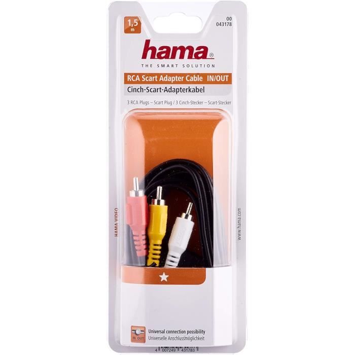 Câble vidéo, fiche péritel mâle - 3 f. RCA mâles (vidéo/stéréo), 1,5m 00205156 Permet la transmission des signaux audio et vidéo entre un lecteur DVD, un récepteur satellite et un téléviseur En stockDélai de livraison: 2-4 jours ouvrables 15,49 € TVA incluse | plus frais de livraison Ajouter à la liste d'envies Ajouter au panier Informations sur l'élimination des déchets... Le câble de haute qualité permet le passae de la vidéo et de l'audio Contenu : 1x Câble audio/vidéo, Péritel - 3 RCA, In/Out Câble Vidéo Audio Péritel 3 RCA Hama Câble Vidéo-audio (câble Péritel Mâle - 3 RCA Mâles Câble Qualité 75 Ohms Câble adaptateur péritel rca pouvant fonctionner dans les deux sens râce au commutateur In/Out (RCA vers Péritel ou Péritel vers RCA) 00205156 Permet la transmission des signaux audio et vidéo entre un lecteur DVD, un récepteur satellite et un téléviseur En stockDélai de livraison: 3-4 jours ouvrables 19.95 CHF TVA incluse | plus frais de livraison Ajouter à la liste d'envies Ajouter au panier Informations sur l'élimination des déchets Soyez le premier à commenter ce... Hama Câble vidéo/audio (câble péritel mâle - 3 RCA mâles (vidéo et stéréo), avec bouton In/Out, longueur de câble de 1,5m) Noir/Rouge/Jaune/Blanc Détails Techniques : Couleur : Noir, Rouge, Jaune, Blanc Longueur : 1,5 m Connecteur : Fiche Péritel mâle, RCA mâle Qualité : Haute Câble péritel mâle-mâle 0,8 m ASTRELL | Bricomarché