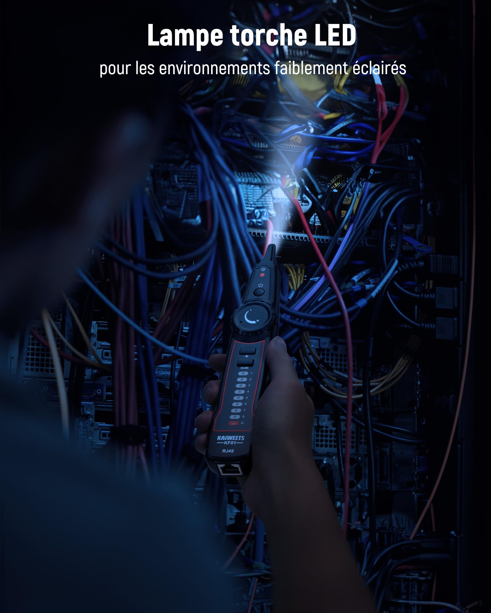 Testeur Câble RJ45 RJ11 LAN Testeur De Câbles RJ45/RJ11 Avec Générateur De Tonalité LAN SCOUT Klein Traceur Câble Réseau Testeur de câble réseau multi-modulaire Testeur de câble téléphonique Ce testeur de câble détecte la configuration correcte des broches des différents câbles réseau en comparant l'extrémité d`émission avec l'extrémité de réception correspondante. Grâce à l'unité distante, vous pouvez facilement tester les câbles et les connexions existants. Idéal pour tester les fils derrière les murs ou dans le plafond. Vous pouvez facilement vérifier la... Remarque : Coupez l'alimentation avant de tracer des fils métalliques pour éviter d'endommager l'appareil Compatibilité multi-câbles : prend en charge les cable RJ11, RJ45, lignes téléphoniques et autres fils métalliques. Bouton de réglage du volume pour optimiser la réception du signal et réduire le bruit. Testeur de câbles réseau KAIWEETS KF01 Vidéo de marchand Lampe torche LED intégrée pour une utilisation aisée dans les espaces sombres ou étroits Signal sonore puissant et indicateur LED lumineux facilitent la localisation du câble – portée jusqu'à 300 mètres Prend en charge les tests de continuité, de niveau et de polarité – idéal pour les réseaux domestiques, industriels ou télécom Détecteur De Câble, Testeur Rj45 Rj11 Pour Lignes Testeur De Câble...
