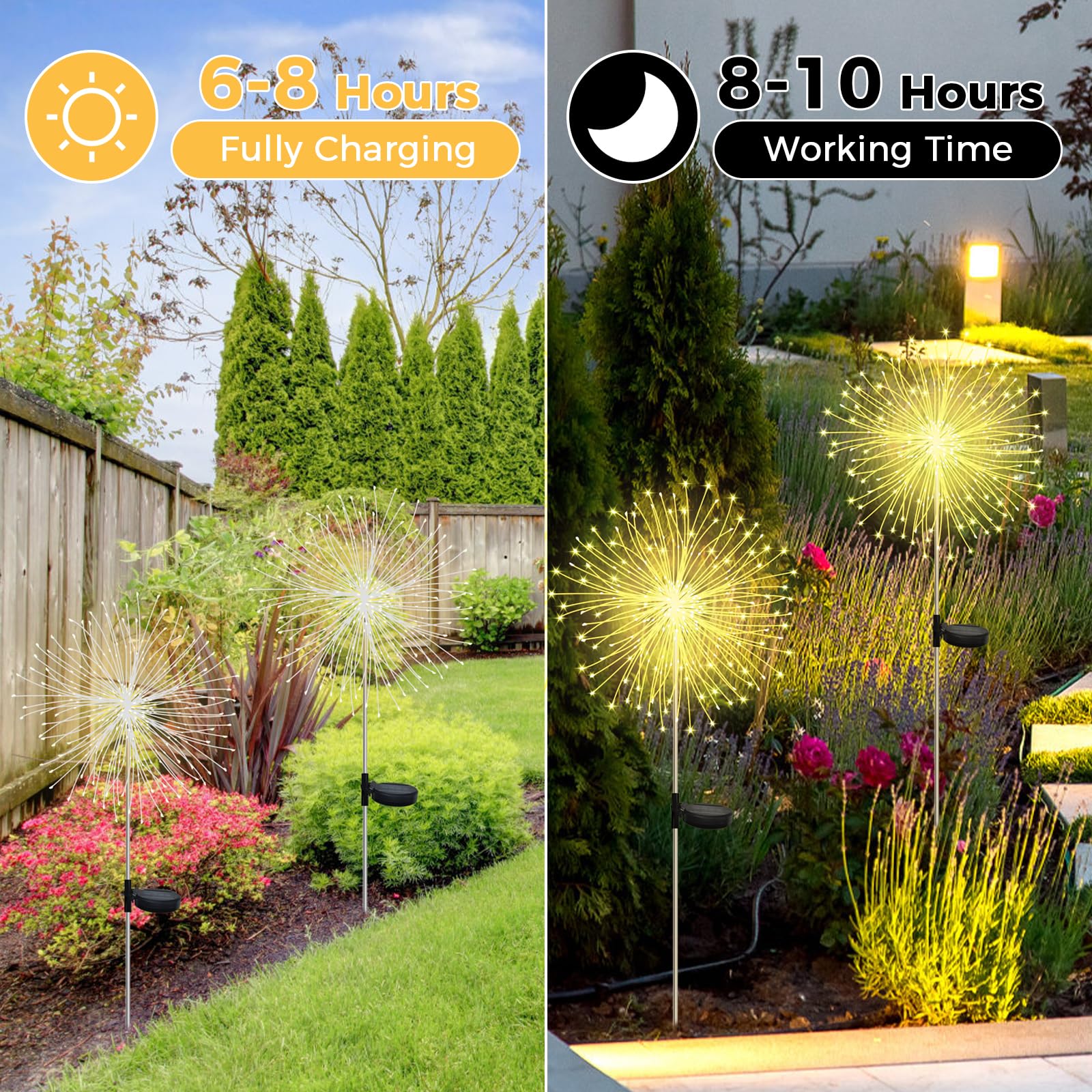【2 Pieces Solar Garden Lights】Each stake has 120 LEDs distribution in 60 branches copper wire, solar firework light is made of flexible copper wire with bright LED beads, and you can bend any shape you want to decorate way yards garden patio. 8 Modes d'éclairage et fonction mémoire]Les lumières de jardin de feu d'artifice disposent de 8 modes de clignotement, vous pouvez personnaliser votre style de fête en changeant le mode avec le bouton sur le panneau solaire. [8 Modes d'éclairage et fonction mémoire]Les lumières de j... 【IP65 Waterproof & Long Operating Time】 Les lumières solaires de pissenlit de jardin plug sont IP65 étanches et peuvent également être utilisées sur les jours de neige et de pluie. La puce mémoire intégrée enregistre votre dernier réglage, de sorte que vous n'avez pas besoin de régler le mode tous les jours. Feux D'artifice Solaires 120 LED AcaJoe Lampe Solaire Exterieur Jardin 2 Pièces 120 LED Feu D'artifice Solaire Guirlande Lumineuse Dehors Etanche 8 Modes D'éclairage Pour Patio Fête De Noël Cour Décorative (Couleur Pissenlit Solaire 120 LED La puce de mémoire intégrée enregistre votre dernier réglage de mode, de sorte que vous n'avez pas besoin de réinitialiser le mode tous les jours. Description du produit Les lampes solaires de jardin sont parfaites pour toutes les occasions spéciales, une atmosphère charmante pour votre jardin, fête, mariage, arrière-cour, trottoir, terrasse, Noël ou tout autre moment décoratif que vous voulez. 【8 Modes d'éclairage et fonction mémoire】Les lumières de jardin de feu d'artifice disposent de 8 modes de clignotement, vous pouvez personnaliser votre style de fête en changeant le mode avec le bouton sur le panneau solaire. Avec 6-8 heures de charge du soleil pendant la journée, les lumières solaires peuvent fonctionner pendant 10-12 heures la nuit. 【DIY design, widely used】Solar lights garden can be DIY modelling (such as flowers, fireworks, heart shapes) according to your requirements. ) qui s'adaptent à votre thème et créent un excellent éclairage d'ambiance LED. Vous pouvez même l'utiliser sous la pluie ou la neige Lampes solaires de jardin améliorées 2024 : ces lampes solaires d'extérieur sont équipées de 120 LED dans le fil de cuivre comme des étoiles brillantes, elles s'étendront de bas en haut et fleuriront comme un feu d'artifice, apportant un effet d'éclairage magique et romantique à votre jardin la nuit. et le tube de protection a été amélioré en PVC pour éviter la fusion due à la... 8 modes clignotants Vous pouvez appuyer sur le bouton sur le panneau solaire pour contrôler 8 modes de clignotement différents (lumière fixe/clignotant, etc. Décoration unique pour les fêtes, l'extérieur, l'été, Noël, Thanksgiving. Led Lampes Solaires De Jardin, Ip65 Étanche Lumiere Solaire Exterieur
