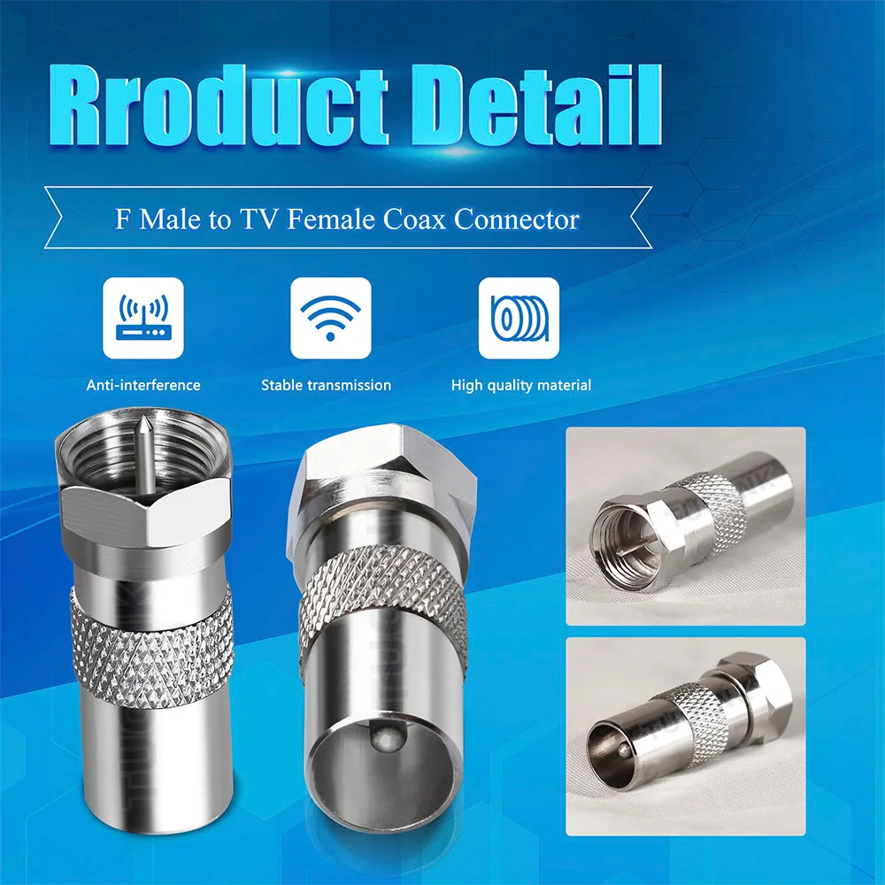 Il suffit de les insérer entre le câble F-type et le port coaxial pour une transition fluide entre satellite et coaxial. Ce set vous évite l’achat de câbles coûteux ou des travaux d’installation complexes. 【Installation rapide】Aucun outil requis : il connecteur F vers IEC suffit d’insérer l’adaptateur entre le câble F-type et le port coaxial IEC. Grâce à leur conception simple, ces adaptateurs ne nécessitent aucun outil pour l'installation. KIT CONNECTEUR SATELLITE F-Type Coaxial Satellite TV Parabole Antenne Le kit comprend 2 adaptateurs F femelle vers coaxial mâle IEC et 2 adaptateurs F femelle vers coaxial femelle IEC, offrant une solution complète pour divers besoins de connexion. Les adaptateurs sont fabriqués en métal robuste, avec un blindage intégral qui protège le signal contre les interférences et garantit une transmission stable et fiable. Large compatibilité]Connecteur F coaxial convient aux téléviseurs, radios, récepteurs TNT, box câble, enregistreurs, décodeurs satellite et systèmes... Solution économique pour adapter facilement plusieurs connexions à la maison. Chaque adaptateur transforme une fiche F femelle en fiche ou prise coaxiale IEC (mâle ou femelle), permettant une adaptation rapide sans avoir à remplacer vos câbles existants. 【Large compatibilité】Connecteur F coaxial convient aux téléviseurs, radios, récepteurs TNT, box câble, enregistreurs, décodeurs satellite et systèmes multimédia utilisant des connecteurs IEC mâles ou femelles. Installation Facile Sans Outil 4 Pièces Adaptateur Antenne Tv,Connecteur F Coaxial Sat Blindage Métal Interférences JZK 2 PCS F femelle vers TV mâle/9,5 mm femelle connecteur coaxial d'antenne TV, adaptateur coaxial RF d'antenne satellite, connecteur SAT pour câble d'antenne et satellite Permet une mise à niveau simple de votre réseau de réception TV.