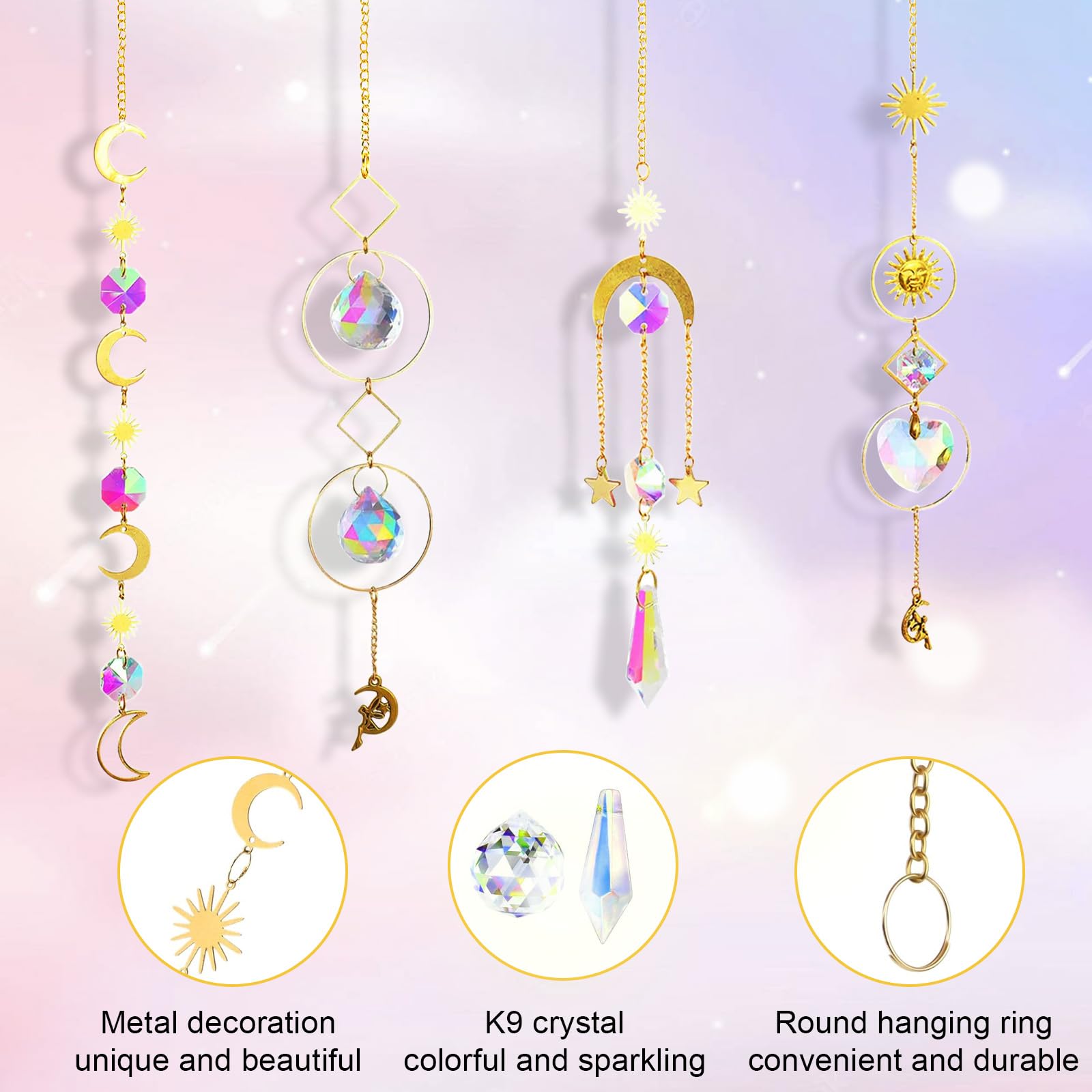 Décoration Fenêtre Arc En Ciel 2 Pièces Attrape-Soleil En Cristal, Sun Catcher, Attrape Soleil Cristal Suncatcher étoile Lune Pendentif Attrape Soleil : Signification des Couleurs et des 5 Elements du feng Shui MengQiLe 200 Pcs Attrape Soleil, Suncatcher Pendentif en Cristal 【Matériau de haute qualité】Le Sun Catcher Pendentif est fabriqué en cristal hautement transparent, après un meulage et un polissage soigneux, la surface est lisse et délicate, limpide, durable et plus incassable. Utilisation Polyvalente: Avec ce suncatcher cristal, vous pouvez décorer à l'intérieur comme à l'extérieur, le suspendre où bon vous semble, parfait pour les fenêtres de cuisine, salons, chambres, vérandas, porches ou lustres, laissant de belles couleurs sous la lumière du soleil 【Cadeau romantique】Quelle surprise pour une fille, une petite amie, une maman, une grand-mère, une meilleure amie, une fille ou vous-même à Noël, un anniversaire, une fête, la Saint-Valentin, un mariage, des fiançailles, des félicitations, une fête. 【Design unique】Avec des étoiles, lune motifs créatifs, et un prisme étincelant, ce Attrape Soleil en cristal allie esthétique et fonctionnalité. Les pendentifs en cristal arc-en-ciel brillent si intensément au soleil qu'ils semblent vouloir illuminer tout le ciel. Spécifications du produit Matériau :Verre cristal Modèle :Étoiles, Lune Taille :Longueur environ 40 cm Le paquet comprend :2 * Attrape Soleil