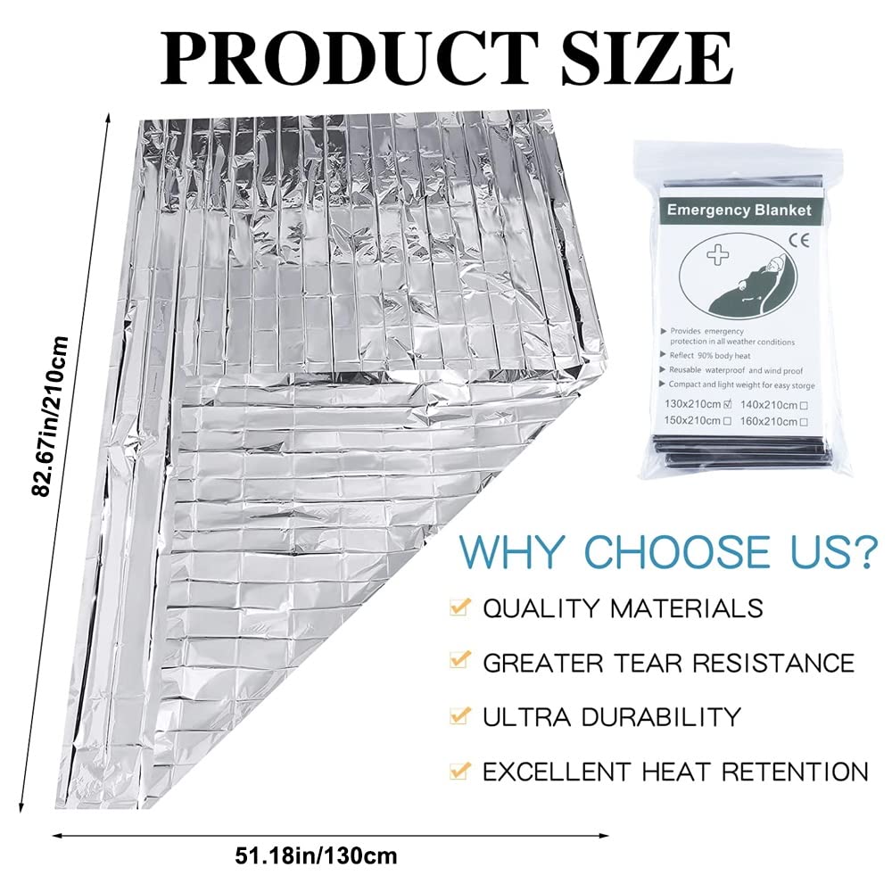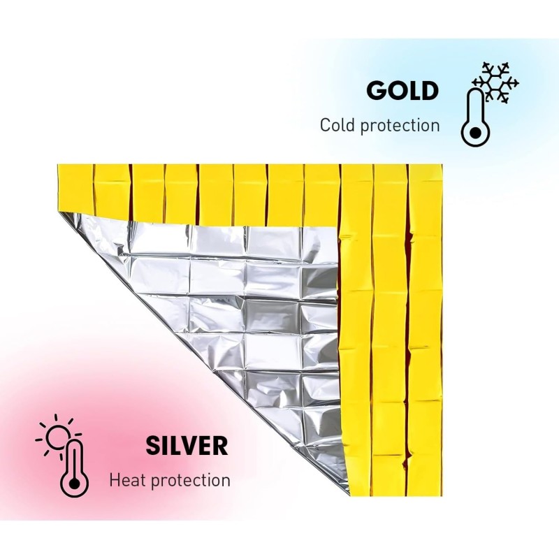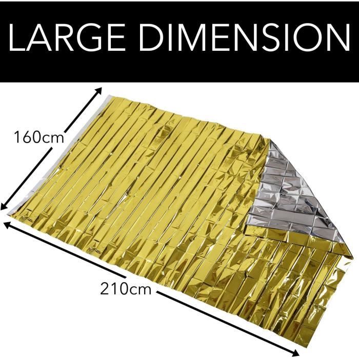 Couvertures De Survie MIXIAO Lot De 6 Couvertures Thermiques De Survie En Feuille D'aluminium Couverture Couverture de survie stérile 210cm x 160cm Couverture Survie 210x160cm Réutilisable 6 Pièces Couverture De Survie, 210×160cm, Réutilisable Extra Couverture De Survie Reutilisable 6 Pièces Couverture de Survie, 210×160cm, Réutilisable Extra Large Thermique Urgence pour l'extérieur, Randonnée, Survie, Marathons, Premiers Secours Idéale pour les trousses de premiers secours, les sacs à dos, les sacs de voyage et les trousses d'urgence pour la maison ou la voiture, c'est un article indispensable pour les aventures en plein air. Couverture De Survie 5X- Réutilisable - Extra Large - 210 * 160Cm... 【Indispensable pour les activités de plein air】 couverture thermique d'urgence portable, imperméable et coupe-vent, qui conserve 90 % de la chaleur corporelle. 【Très grande taille】 notre couverture de survie surdimensionnée mesure 160 × 210 cm (63 × 83 pouces), soit 24 % de plus que les couvertures coupe-vent standard. 【Utilisations polyvalentes】 les couvertures thermiques d'urgence peuvent servir de bâches réfléchissantes pour signaler une situation de détresse aux sauveteurs, mais aussi de ponchos imperméables, d'abris d'urgence, de pare-soleil, de brise-vent, de doublures de sacs de couchage et de récipients pour recueillir l'eau. Avec une épaisseur de 12 μm, elle offre une couverture supérieure pour conserver la chaleur corporelle.