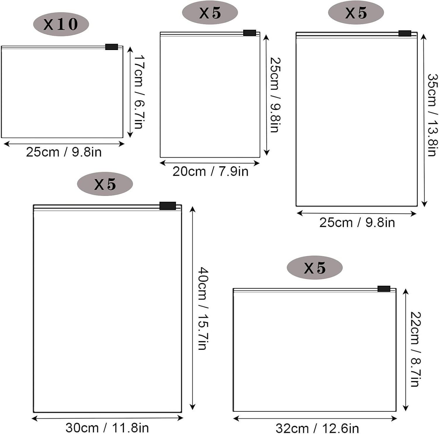 Cooyou 20 Pièces Sac de Rangement, Zipper Seal Pochette étanche, Sac... Matériaux de Haute Qualité: Sac plastique zip fabriqué en plastique de haute qualité, respectueux de l'environnement et durable, avec une excellente durabilité et résistance à la déchirure ; avec des fermetures éclair lisses, une bonne étanchéité, une excellente résistance, peut être utilisé pendant une longue période, ne se détériore pas facilement, simple et pratique, peut être réutilisé. Conception Ventilée: Pochette plastique zip bien scellée, sacs à dos de rangement plastique elle empêche efficacement l'humidité et la poussière de pénétrer et protège vos articles de l'humidité et de la saleté; Pochette voyage sachet équipée de trous d'aération pour augmenter la capacité de respiration, les vêtements secs ne deviendront pas humides ou moisis lorsque vous les y placerez. Organisation Vêtements Et Cosmétiques Sac Rangement Valise AiQInu Sac De Rangement 20 Pièces Zipper Voyage Pochette, Sac De Rangement Transparent Pour Vêtements, Chaussures, Cosmétique (Daisy) 4 Tailles Organiseurs De Bagage Pochettes étanches Transparentes 30x20cm Note : Si vous n'êtes pas satisfait de votre sac zippé transparent, veuillez nous consulter directement, nous le prendrons au sérieux et résoudrons vos problèmes et votre confusion en temps opportun. Sachet Plastique Transparent, 15 Pièces Sac De Rangement Voyage Zipper... Spécification : Nom de l'article : sac de rangement vetement zip carré Matériau : Plastique Couleur : transparent Taille : 20*30cm/7., 87*11., 81inch Paquet comprend : 25* sac de rangement vetement zip carré Caractéristiques 1., Le design givré permet non seulement d'identifier facilement les éléments à l'intérieur, mais aussi de protéger la vie privée et d'éviter l'embarras., 2., Aucun aspirateur ou pompe n'est nécessaire pour évacuer l'air, il suffit d'appuyer sur les deux mains pour expulser l'air., 3., Répartis de manière claire et judicieuse, vous trouverez rapidement ce dont vous avez besoin ; vous économiserez beaucoup d'espace et garderez vos affaires bien rangées. 50 Pièces Sac Zipper Voyage, Sac de Rangeent Plastique Transparent