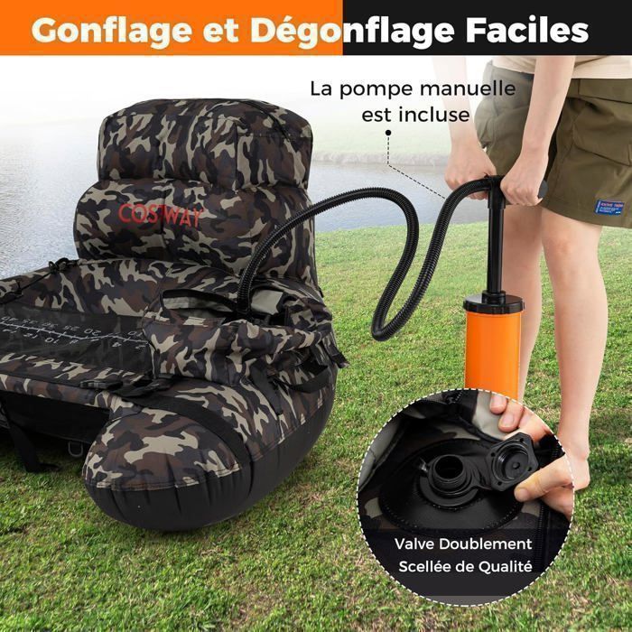 # 𝐅𝐚𝐜𝐢𝐥𝐞 à 𝐓𝐫𝐚𝐧𝐬𝐩𝐨𝐫𝐭𝐞𝐫 # Ce bateau de pêche portable ne pèse que 6,5 kg et est équipé de bretelles de sac à dos réglables pour un transport confortable. Porte Canne Bateau GYMAX Tube Flottant De Pêche Gonflable, Bateau De Pêche Charge 150KG, Avec Pagaie, Palmes, Règle à Poissons, Porte-Canne à Pêche, Pompe Manuelle, Poche De Rangement, Sac à Dos Portable Cumberland Float Tube Traits Dominants Gonflage facile avec pompe manuelle et valves Boston doublement scellées Porte-canne à pêche et règle à poissons pratique pour un positionnement optimal et une mesure précise Avec bretelles de sac à dos réglables et poignées pratiques pour un transport facile Intérieur en PVC de haute qualité et extérieur en polyester pour une résistance à la perforation Comprend un dossier 2-en-1 et un sac de rangement pour un confort et une commodité accrus Inclut 2 poches de rangement latérales et des attaches latérales pour garder le matériel organisé Ceinture de sécurité sur le siège pour garantir une sécurité supplémentaire lors de la pêche Accessoires complets inclus : pompe, porte-canne à pêche, pagaie, palmes, kit de réparation, cordes de fixation et stators d'hameçons Infos Détaillées Couleur: Camouflage Matériau: Polyester, PVC, Alliage d'Aluminium Dimensions du Produit : 110 x 108 x 64 cm (L x l x H) Capacité Maximum de Poids : 150 kg Poids Net : 6,5 kg Le Colis Comprend 1 x Float Tube de Pêche Gonflable 1 x Pompe 1 x Porte-Canne à Pêche 1 x Pagaie en Aluminium 2 x Palmes 1 x Kit de Réparation 2 x Cordes de Fixation 2 x Stators d'Hameçons 1 x Manuel d'Instructions Bateau de Pêche Gonflable avec 3 Chambres à Air, Bateau Gonflable avec... De plus, il inclut 2 stators d'hameçons pour sécuriser vos cannes à pêche. # 𝐌𝐚𝐭é𝐫𝐢𝐚𝐮 𝐒é𝐥𝐞𝐜𝐭𝐢𝐨𝐧𝐧é & 𝐒𝐭𝐫𝐮𝐜𝐭𝐮𝐫𝐞 𝐅𝐢𝐚𝐛𝐥𝐞 # Construit pour durer, ce float tube de pêche est fabriqué en PVC de haute qualité pour les chambres intérieures et renforcé avec du polyester épais à l'extérieur. Tube flottant de pêche FLTB-5 V2 - Gris fonc, Orange fluo - Caperlan... Inclus dans le paquet : 1 x bateau de pêche gonflable, 1 x pompe, 1 x porte-canne à pêche, 1 x pagaie en aluminium, 2 x palmes, 1 x kit de réparation, 2 x cordes de fixation, 2 x stators d'hameçons. # 𝐆𝐨𝐧𝐟𝐥𝐚𝐠𝐞 & 𝐃é𝐠𝐨𝐧𝐟𝐥𝐚𝐠𝐞 𝐅𝐚𝐜𝐢𝐥𝐞𝐬 # Ce float tube de pêche gonflable est équipé d'une pompe manuelle permettant un gonflage et un dégonflage rapides et faciles en seulement 15 minutes. Ses dimensions sont de 110 x 108 x 64 cm (L x l x H) et il offre une grande capacité de charge de 150 kg. GYMAX Planche Gonflable Adulte, 305x76x16CM, Board en PVC avec Sac de # 𝐀𝐜𝐜𝐞𝐬𝐬𝐨𝐢𝐫𝐞𝐬 𝐂𝐨𝐦𝐩𝐥è𝐭𝐞𝐬 𝐈𝐧𝐜𝐥𝐮𝐬 # Ce paquet contient tout ce dont vous avez besoin pour une sortie de pêche réussie. Il y a également 2 poches de rangement latérales pour plus de matériel, ainsi que des attaches latérales pour organiser la pagaie.