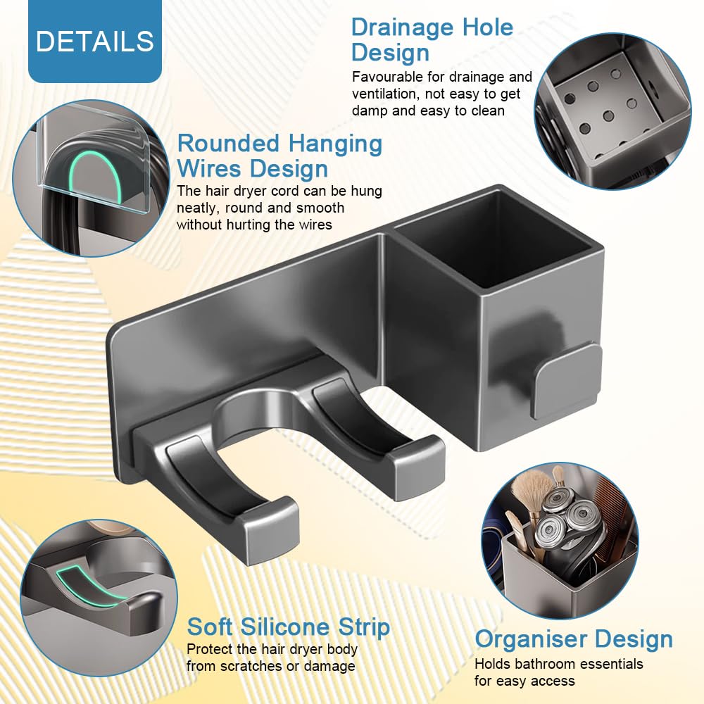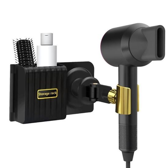 Support De Sèche Cheveux Sans Perçage Support Sèche-cheveux Mural Sans Perçage, Support Sèche-cheveux En Aluminium, Support Support Seche Cheveux Dyson Support De Sèche - Cheveux Sans Perçage, Support De Sèche - Cheveux, Sans Perçage, Support De Seche Cheveux Sans Percage Support De Seche Cheveux Sans Percage Support De Seche Cheveux Avec Support De Prise Et Stockage Avec Support De Cable Compatible Avec La Plupart Noir 85219815 Support mural pour sèche-cheveux - Support pour sèche-cheveux de salle... L'ouverture en forme de U est équipée d'un tapis en silicone souple qui réduit efficacement l'usure et les rayures., 3., Le design ouvert assure une évacuation efficace de l'eau, empêche l'accumulation d'eau et l'humidité, garde le support de sèche-cheveux sec et propre et facilite le nettoyage quotidien. Dimensions : 14 × 13,8 × 9 cm Poids : 408 g. 【Léger et robuste】Support de sèche-cheveux fabriqué en aluminium de haute qualité, haute résistance, durable, résistant à la corrosion, résistant à la chaleur, facile à nettoyer et adapté à une utilisation à long terme. Détails du produit : 1., Idéal pour les salles de bains, hôtels, salons de coiffure et salons de beauté., 2., Design moderne et simple avec des lignes fluides et fines. Rangement multifonctionnel : deux compartiments de rangement à l'arrière, facile à ranger, peut contenir des articles de toilette ou des prises. Montage sans perçage : le design ne nécessite pas de trous de perçage et n'endommage pas le mur. Après la pose sur le mur, laissez reposer 24 heures pour assurer une adhérence ferme. CSPARKV 12x10cm Support mural pour sèche-cheveux compatible avec la...