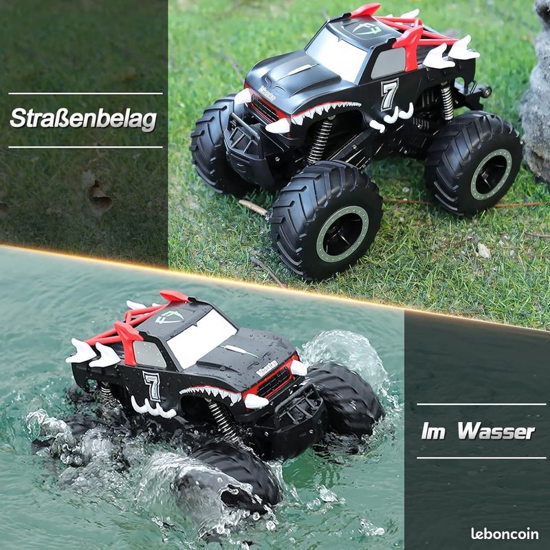 Un camion-monstre rouge avec un grand sourire pour les enfants... Capacité tout terrain : avec des pneus tout-terrain et un système de suspension absorbant les chocs qui convient au sable, à l'herbe, à la neige et à divers terrains, assurant une conduite stable. Cadeau parfait : idéal pour les garçons âgés de 6 à 12 ans, un cadeau parfait pour les anniversaires, Noël ou Halloween qui apporte un plaisir sans fin. Camion Monstre Télécommandé Tecnock Voiture Télécommandée à L'échelle 1/16, 2WD Haute Vitesse 20 Km/h, Camion Monstre RC Tout Terrain Avec 2 Piles Rechargeables Et Lumières De Châssis Principal, Jouets Cadeaux Pour Enfants Et Voiture Thermique Essence Performance à grande vitesse : équipé d'un moteur haute performance qui atteint des vitesses allant jusqu'à 20 km/h, il offre une expérience de conduite passionnante pour les garçons âgés de 6 à 12 ans. Parfait pour les anniversaires, les vacances ou toute occasion spéciale, cette voiture télécommandée offre un plaisir sans fin pour les enfants, qu'ils courent à l'intérieur ou profitent d'activités de plein air Description du produit Carox Voiture RC à échelle 1:16 pour enfants, 2,4 GHz haute vitesse, 20 km/h, double batteries rechargeables de 1000 mAh, pneus tout-terrain, suspension amortissante, cadeau idéal pour les garçons âgés de 6 à 12 ans Avertissement De Sûreté Comprend des jouets. Voiture RC à l'échelle 1/16 1/16 échelle RC voiture dinosaure Style 4 canaux 10 KM/H vitesse