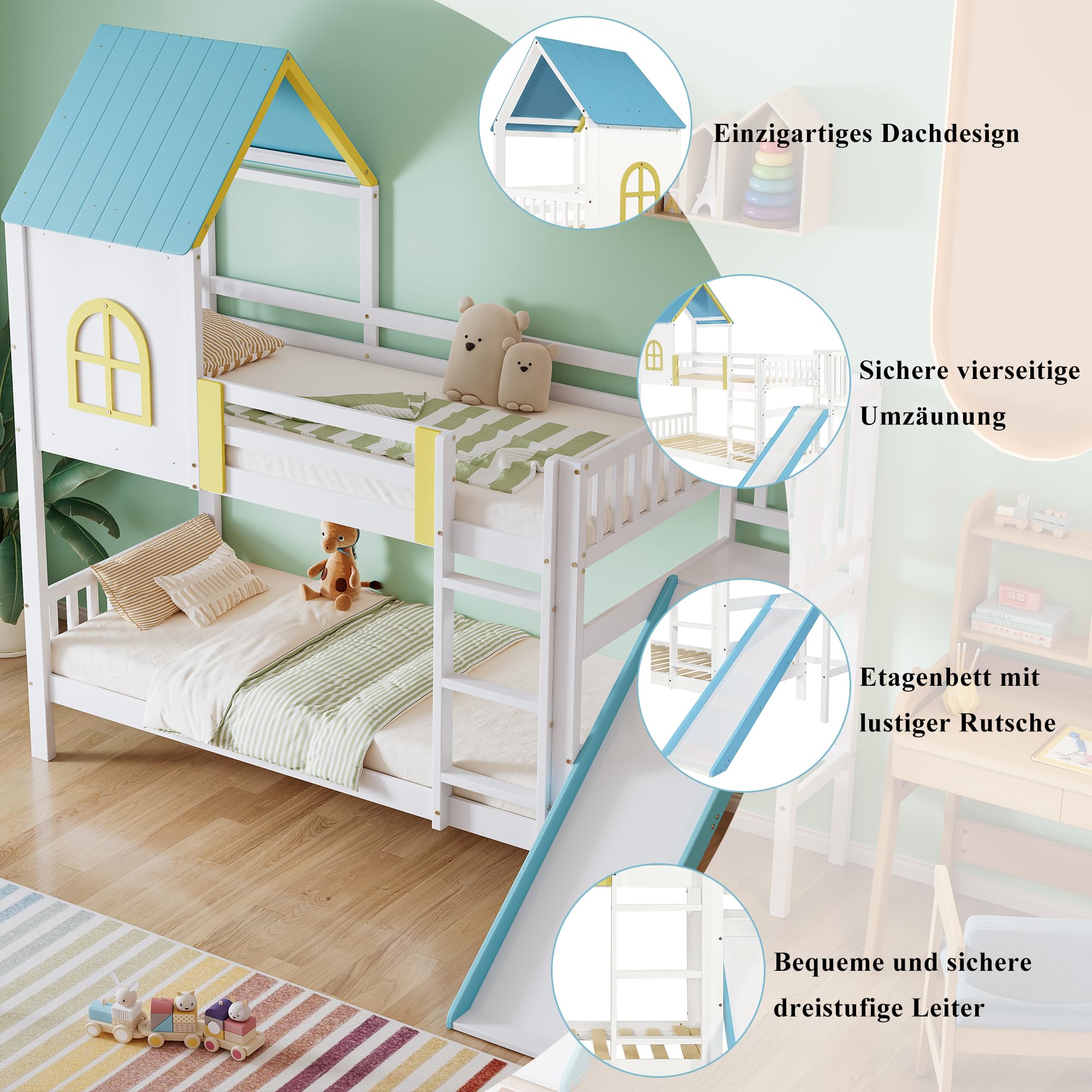 Lit Enfant Barrière Sécurité Fenêtre Lit Superposé 90x200cm - Lit Cabane D'enfant Avec échelle, Toboggan, Toit Et Fenêtre - Anti-chute - Lit En Pin Naturel+blanc Lit Superposé Certifié En747 Avec le fenêtre, les clôtures et l'escalier de rangement, ce lit superposé possède une apparence spéciale et il crée une atmosphère de conte de fées pour vos enfants Lit superposé 90x200cm, lit cabane avec échelle à droit, anti-chute 【Armoires latérales pratiques à échelle】 : Le lit superposé est équipé d'armoires latérales à échelle qui offrent un espace de rangement supplémentaire et optimisent l'utilisation verticale de l'espace. Lit superposé 90x200cm pour 2 enfant - lit cabane en bois avec escalier... Ce lit a subi des tests rigoureux pour garantir la solidité structurelle du lit et la qualité des matériaux utilisés. 【Conception unique】 : le lit présente une conception de toit unique avec une découpe circulaire, donnant au lit un aspect charmant et individuel. Le lit présente des détails de fenêtre qui ressemblent à l'apparence d'une vraie maison et ajoutent une touche ludique à la pièce. Taille totale : 253,5x95,5x206cm Poids total : 93 kg Matelas adaptés (matelas non inclus) : 90x200cm Capacité de charge : 120 kg Distance entre deux lits : 71CM Caractéristiques Nom du produit : lit superposé Couleur : Blanc + Naturel Matériau du cadre : pin + MDF Matériau des lattes : bois Méthode d'installation : installez-le vous-même Numéro de colis : 4 Pays d'origine : Chine Remarque : ce produit contient 4 colis, il est normal de recevoir 4 colis à des moments différents, veuillez être patient., Certificat FSC : Oui