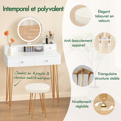 Notre équipe d'assistance réactive est toujours prête à vous aider, vous garantissant une expérience fluide et sereine. Meuble Maquillage Rangement Lumineux Coiffeuse ALFORDSON Avec Miroir Et éclairage, Ensemble De Toilette 90 Cm Avec 4 Tiroirs Et Tabouret De Rangement, Couleur Bois - Maison Table Maquillage LED Description du produit ALFORDSON Série de coiffeuses Un grand espace de rangement et un design épuré : cette coiffeuse est dotée de quatre tiroirs spacieux et de 12 LED. Le tabouret assorti offre un espace de rangement supplémentaire pour le maquillage, les articles de toilette, les bijoux et bien plus encore, disposés de manière soignée et élégante ✔ Modes d'éclairage réglables pour une ambiance parfaite : Cette coiffeuse blanche comprend un miroir entouré de 12 ampoules LED avec 3 modes de température de couleur et une luminosité réglable, créant l'éclairage idéal pour se maquiller, se détendre ou faire la fête. ✔ Montage facile et assistance client dédiée : Livré avec des instructions claires étape par étape et des pièces étiquetées pour un montage facile, généralement réalisé en 4 à 5 heures par deux personnes. Coiffeuse avec miroir et éclairage, style ferme, avec tabouret, multiprise, 2 tiroirs, rangement... ✔ Rangement spacieux et design organisé : Mesurant 90 cm (L) x 40 cm (l) x 140 cm (H), cette coiffeuse dispose de 4 tiroirs spacieux et de 12 ampoules LED. 1 Forte capacité stockage 2 2 couleurs disponibles 3 Coiffeuse série Ⅰ 4 Coiffeuse Série II 5 Présentation d'ALFORDSON Notre service client professionnel est toujours prêt à vous aider pour toute question ou problème, vous garantissant une expérience d'achat sereine. ALFORDSON Ensemble de Coiffeuse avec Miroir, 4 tiroirs et Série de coiffeuses ALFORDSON ✔ Service après-vente sans souci – Remplacement gratuit des pièces et assistance conviviale : Si une pièce est manquante ou endommagée, nous vous enverrons une pièce de remplacement gratuite ; aucun retour n'est nécessaire.
