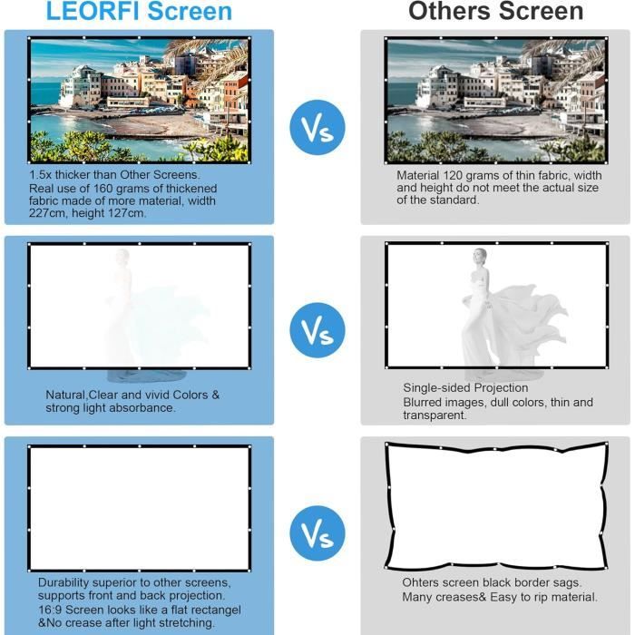 Il se range compactement dans un sac de transport imperméable (mesurant seulement ~122 x 13 x 21 cm), permettant de le glisser facilement dans la plupart des coffres de voiture ! Une stabilité accrue est offerte par les piquets de sol et les cordes anti-vent inclus. écran 5m Format 16:9 Résolution 4K Écran De Projection 180 Pouces Avec Support Portatif, LEORFI Portable écran De Projection Écran de Projection - LEORFI - 100 Pouces - Tissu Épais - 100% Sans Froissure - Portable... ★ 【COMME UN ÉCRAN FIXE & ENTRETIEN FACILE】Malgré sa grande taille, cet écran de projection portable extérieur utilise des matériaux innovants et une méthode de montage unique pour obtenir une surface parfaitement plane et des bords nets, à l'image d'un écran fixe. 1 Soirée Foot Géant 2 Cinéma Camping-Car 3 Soirée en Extérieur 4 Réunion Professionnelle 5 Festival de Musique Le design pliable reste léger pour un rangement facile dans le sac de transport. Si vous rencontrez des difficultés lors de l'utilisation, contactez-nous et nous vous apporterons une solution ! Cela élimine les plis et les bords disgracieux en toile d'araignée courants sur les écrans portables de qualité inférieure, garantissant une expérience visuelle professionnelle pour votre cinéma de jardin. ★ 【ÉCRAN GÉANT 200 / 5M - LE PLUS GRAND QUE NOUS CONNAISSONS】Offre une diagonale de 200 pouces (5m), un format 16:9, un angle de vision de 160° et une résolution 4K Ultra HD (L: 4., 5m H: 3m). C'est le choix parfait pour les voyages, le camping ou pour créer votre propre expérience home cinéma - que vous soyez seul ou en famille. ★ 【MISE À JOUR 2025 - SUPPORT ACIER LÉGER & DÉMONTABLE】Contrairement aux produits concurrents fragiles, le design de l'écran de projection LEORFI avec support inclut un trépied télescopique renforcé en acier de 32mm d'épaisseur (32mm vs 28mm pour les autres). Écran de film XXL étonnamment portable : emportez votre cinéma n'importe où : malgré sa taille géante, l'ensemble du système ne pèse que 9,5 kg et se range de... ★ 【PORTABLE & INSTALLATION RAPIDE EN 3 MIN】 Malgré ses dimensions généreuses, cet écran de projection pour extérieur est léger et incroyablement facile à ranger et à transporter. Idéal pour jardin, écoles, bureaux, mariages, églises et plus encore ! Cet écran de projection extérieur est fabriqué en polyester épais et flexible (200g/m²), au toucher doux, garantissant une résistance aux plis. Écran de Projection 200 Pouces (455x300) avec Support, 4K