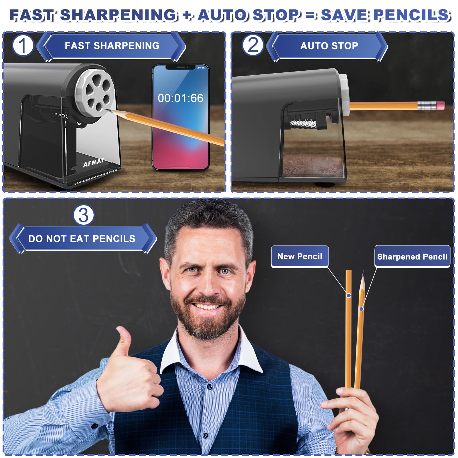 Les enseignants apprécieront l'efficacité de pointe rapide dans les salles de classe occupées, ce qui garantit une transition transparente entre les leçons. Taille-crayon électrique, lame hélicoïdale en acie... - Grandado Les enfants et les étudiants l'utilisent efficacement et en toute sécurité au quotidien. Taille-crayon Pour Crayons De 6 à 11 Mm Akozon Taille-crayon électrique Robuste Taille-crayons Bleu Durable Taille-crayon Rapide Arrêt Automatique Parfait pour les salles de classe, la maison, les studios et les chantiers de construction : ce taille-crayon aiguise les crayons en seulement 3 secondes tout en conservant la longueur du crayon grâce à sa lame de précision. Les artistes peuvent compter sur sa polyvalence et travailler une large gamme de crayons spéciaux, du graphite standard aux outils d'esquisse triangulaires, ce qui améliore le flux de travail créatif. 108 Trous Trousse À Crayons Rouleau Pour Crayons De Couleur Sac À... Idéal pour les actions rapides dans une journée trépidante à l'école, au bureau ou à la maison. Doté d'une technologie d'arrêt automatique et d'un design robuste, le taille-crayon AFMAT allie sécurité, efficacité et durabilité, ce qui en fait l'outil idéal pour les étudiants, les artistes, les artisans et toute personne à la recherche d'une solution simple, pratique et puissante pour tailler les crayons. Idéal pour les salles de classe encombrées : il peut tailler plus de 600 crayons d'affilée sans avoir à poser après chaque utilisation. La puissante motricité garantit un fonctionnement continu Le récipient à copeaux transparent de grand volume réduit le nombre de vidanges de copeaux, tandis que le pied stable et antidérapant assure un maintien sûr pendant l'utilisation. Les ouvriers du bâtiment apprécieront la possibilité de tailler facilement les crayons de charpentier de 11 mm d'épaisseur et ainsi de gagner du temps lors du dessin de plans de construction ou des dimensions sur le chantier. Grâce à la batterie intégrée de 2500 mAh, vous n'aurez plus besoin de chercher des prises sans être lié aux lignes électriques. Équipé d'un moteur haute performance et de six trous pointus réglables, le taille-crayon électrique AFMAT haute performance avec boîte révolutionne la préparation des crayons de toutes formes de 6 à 11 mm. Facile à nettoyer et à entretenir : le taille-crayon électrique est équipé d'un récipient transparent de grande capacité qui vous permet de surveiller facilement la capacité et de l'éliminer rapidement, réduisant ainsi la fréquence d'entretien et gardant votre bureau propre.