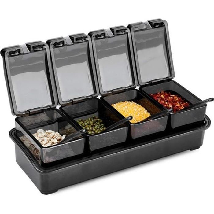 Facile à utiliser : le couvercle pivotant permet une ouverture et une fermeture sans effort d'une seule main pour un rangement hygiénique. Matériau de qualité supérieure et de qualité alimentaire : fabriqué en matériau ABS robuste, renforcé à l'intérieur et à l'extérieur pour plus de durabilité et de commodité au quotidien. Compartiments intérieurs amovibles : conteneurs amovibles individuellement pour un nettoyage facile et une utilisation flexible – plus de transvasement fastidieux ! Poignée antidérapante : les rainures latérales offrent une prise en main sûre et confortable pour une prise en main et un transport faciles. CGBE boîte à snacks avec copartients, lot de 2, plateau fruits et légues avec 8+4 Caractéristiques du produit : Matériau : ABS de qualité alimentaire (sûr et durable) Couleur : noir/blanc (design élégant) Nombre de compartiments : 5 Dimensions totales : 50 x 15 x 10 cm (19,7 x 5,9 x 3,93) Dimensions intérieures : 14 x 8,5 x 7,5 cm (5,51 x 3,34 x 2,95) Poids : 983,4 g (construction solide) Contenu de l'emballage : 1 organiseur à épices avec 5 compartiments Couvercle étanche : le couvercle transparent givré protège de l'humidité, de la poussière et du soleil – préserve l'arôme et la fraîcheur de vos aliments. uyoyous Étagère à épices en bois avec 3 copartients de rangeent, plateau à épices debout en... 5 compartiments et facile à nettoyer : sépare clairement les épices et les aliments. Parfait pour un rangement facile. Parfait pour les pique-niques, les barbecues ou le camping. Boîte Rangement Herbes Condiments ABS IDesign Boîte De Rangement à 3 Compartiments, Grand Bac Plastique Pour Aliments Emballés Ou Récipient 5 Compartiments Boîte D'assaisonneent en Plastique, Récipient de Stockage D'épices Réutilisable Aovible pour... Pas de déversement, pas de désordre