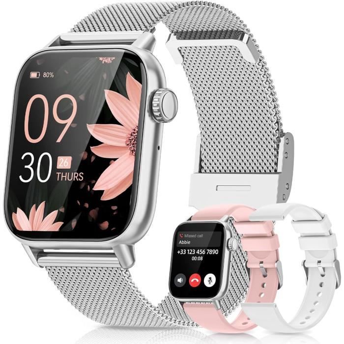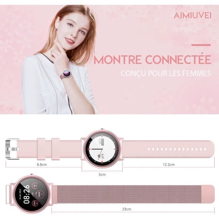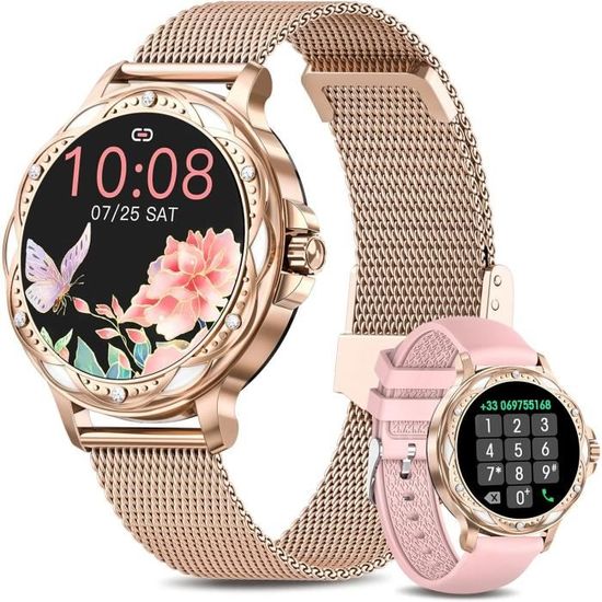 La charge rapide magnétique ne prend qu'environ 2 heures pour une charge complète, vous évitant les recharges fréquentes. ) et les analyse en temps réel avec votre téléphone pour améliorer vos performances. Montre Connectée Femme Samsung Montre Connectée Femme Avec Appels, 4 Bracelets, 1,27" Tft Smartwatch Santé SpO2 Cycle Féminin Montre Connectée Femme Répond/Passe Des Appels, 1.85 Hd Trackers D'Activité Avec 120 Modes Sportifs, Étanchéité Ip68 ; Livraison gratuite. i ; i. Livré entre le... Toutefois, son utilisation n'est pas recommandée dans l'eau chaude ou l'eau de mer. 1 Suivi de la santé 2 Suivi du sommeil 3 Santé des femmes (Impossible d'envoyer le message) Cette montre intelligente est un cadeau original et idéal pour les femmes, parfait pour les amatrices de technologie, les passionnées de sport ou celles soucieuses de leur santé et de leur style. Elle intègre également des fonctions spécifiques : suivi du cycle menstruel, rappel d'hydratation, alerte sédentarité et exercices de respiration, vous aidant à adopter de meilleures habitudes. Élégance au poignet avec 4 bracelets : Écran tactile couleur circulaire TFT de 1,27 pouces, affichage précis et commande fluide. Des fonctions enrichies : météo, réveil, contrôle musical, recherche du téléphone, déclencheur photo à distance, chronomètre, etc. Recevez vos notifications en temps réel sans sortir votre téléphone, et ne craignez plus de manquer un appel ou un message crucial. Analyse automatique du sommeil (profond, léger, phases d'éveil) avec évaluation des rythmes pour un repos réparateur. [120 modes sport et étanchéité IP68 : De la course, du yoga, au cyclisme ou à la corde à sauter Autonomie longue durée pour une vie plus intelligente : Équipée d'une batterie haute capacité de 300mAh, cette montre offre jusqu'à 7 jours d'autonomie (variable selon l'usage) ou 30 jours en veille. font de votre montre un véritable assistant connecté à votre poignet. Cette montre intelligente femme est livrée avec quatre bracelets haut de gamme : le bracelet en acier inoxydable rose doré offre une élégance raffinée, tandis que les bracelets en silicone et tissé allient confort et style sportif, s'adaptant à toutes les occasions. Montre intelligente Colesma pour femme - Appel Bluetooth - Montre
