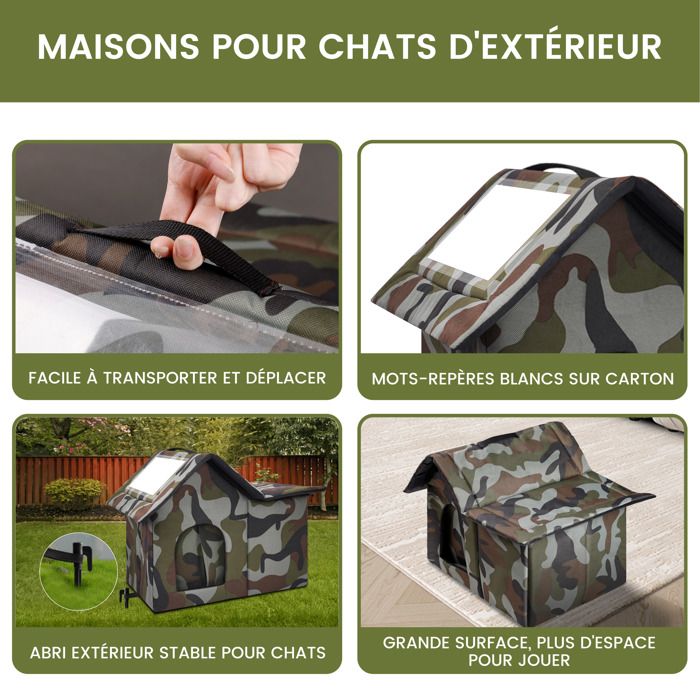 Caractéristiques d'isolation thermique : avec la capacité de bloquer les courants d'air froids et de refléter la chaleur corporelle, ce lit pour chat utilise une couche d'éponge à haute efficacité pour établir un environnement chaud et confortable, ce qui le rend très approprié pour les saisons d'hiver Nche pour chat d'extéreur/nchor solée pour l'hver/abr pour chats... Description du produit Le lit pour chat fourni offre une retraite chaleureuse et apaisante pour votre chaton ou chiot, améliorant son expérience de sommeil avec un design confortable. Maisonnette pour chat niche isolée niche chat isolation - Ciel & terre Caractéristiques : Matériau : tissu Oxford., Poids : S : 500 g., M : 650 g., L : 800 g. M : environ 40 x 38 x 35 cm. Niche Extérieure Chat Niche D'extérieur Isolée Pour Chat Pour L'hiver – Abri Abri Hiver Imperméable Taille S M L Chat Errant Extérieur Découvrez un ajout à votre routine de soins pour animaux de compagnie qui privilégie la chaleur et la détente en toute saison. Idéal pour les fournitures pour animaux de compagnie, ce lit pour animal de compagnie est parfait pour une utilisation en intérieur et en extérieur, offrant un confort pendant les mois d'hiver ou les aventures de voyage. L : environ 45 x 43 x 40 cm. Largement utilisé : conçu avec une disposition de style tente fermée, ce petit lit pour chien offre une zone de protection privée, s'intégrant parfaitement dans différents espaces pour une utilisation en intérieur ou en extérieur, offrant un confort et un abri constants tout au long de l'année Conçue pour répondre aux besoins de sécurité de votre animal de compagnie, la structure fermée assure un environnement apaisant à la maison, tandis que sa fonctionnalité polyvalente s'adapte parfaitement à divers environnements, tels que les espaces de vie ou les espaces extérieurs. Remarque : En raison des différents paramètres d'éclairage et d'écran, la couleur de l'article peut être légèrement différente de celle de la photo.