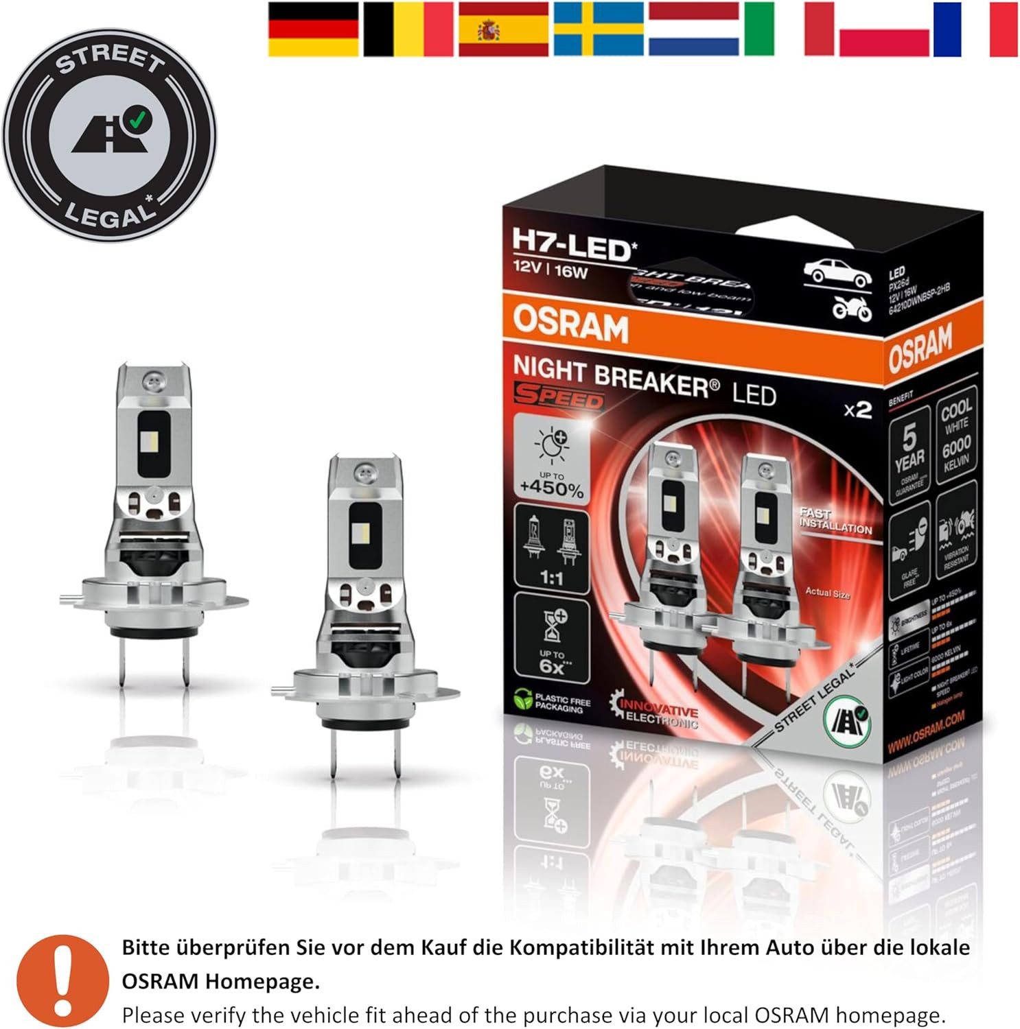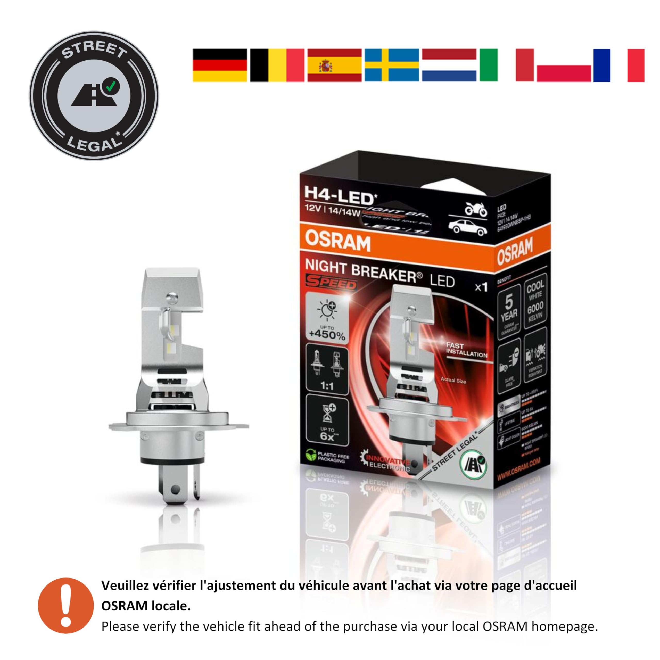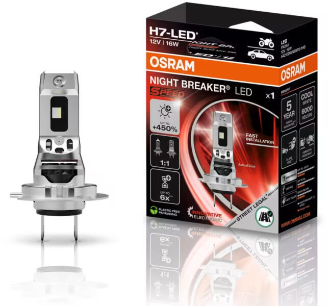 Efficacité accrue, notamment grâce à une électronique innovante et optimisée. OSRAM NIGHT BREAKER LED SPEED H7 450 homologované LED autožárovky, kompaktní verze, balení 2 ks Comparées aux ampoules standard, telles que les ampoules halogènes, ces ampoules LED de remplacement consomment jusqu'à 60 % d'énergie en moins et, grâce à la technologie LED et à leur conception spécialement conçue pour résister aux vibrations, leur durée de vie est jusqu'à six fois supérieure(3). Plus d'informations sont disponibles sur osram., com/nb-led. Le modèle n’est pas universellement compatible. Applicable uniquement dans les pays concernés, avec homologation ou pour lesquels une homologation équivalente est applicable. Avant d'acheter, vérifiez la liste de compatibilité actuelle et d'autres informations légales sur osram., de/ledcheck. OSRAM Night Breaker H7 LED SPEED GEN2 450% Abblendlicht für Alfa Romeo... Rapide à installer, facile à monter, avec la dernière électronique OSRAM innovante à l'intérieur et un design 1:1 à l'extérieur. De plus, OSRAM offre une garantie dédiée sur toutes les ampoules LED de remplacement NIGHT BREAKER(2). Conception 1:1 : dimensions et compatibilité mécanique inspirées des lampes traditionnelles. S'applique uniquement aux pays respectifs avec homologation ou pour lesquels une homologation équivalente s'applique, ainsi qu'aux modèles de véhicules et fonctions d'éclairage actuellement répertoriés dans la liste de compatibilité. Aucun culot ni adaptateur supplémentaire n'est requis pour l'installation de l'ampoule. Osram H7 Vs H4 OSRAM NIGHT BREAKER LED SPEED H7 Pour Motos, Lampe LED Retrofit Pour Motos Homologuées Pour La Route, 6000 K, Installation Rapide, Aucun Accessoire Mécanique Requis, LEDEC02 Intégrée, 1 Lampe Ampoule Led H7 selon les modèles de véhicules et les fonctions d'éclairage actuellement répertoriés dans la liste de compatibilité. Jusqu'à 450 % de luminosité en plus, 6 000 K et température de couleur blanc froid : LED blanc froid améliorée avec une température de couleur proche de la lumière du jour. Remplacez dès maintenant vos ampoules de voiture classiques par les ampoules LED de remplacement révolutionnaires NIGHT BREAKER d'OSRAM et profitez d'une luminosité exceptionnelle, homologuées pour la route(1). Installation simple et rapide : compatibilité mécanique 100% avec les lampes H7 normalisées Veuillez suivre la procédure qui y est décrite avant et après l'installation. Pour une installation rapide et un remplacement facile de vos ampoules halogènes, et une amélioration de qualité pour voir et être vu avec les ampoules LED OSRAM homologuées pour la route(1). Ces ampoules LED de remplacement conviennent parfaitement aux ampoules et douilles classiques. Durée de vie jusqu'à 6 fois supérieure à celle des lampes halogènes traditionnelles. Positionnement 100 % contrôlé des LED pour un alignement optimisé, amélioré et précis. Elles offrent une lumière blanche moderne et éclatante avec une température de couleur allant jusqu'à 6 000 K, un flux lumineux stable même avec une batterie faible et impressionnent par leur luminosité exceptionnelle(2), tandis que l'éblouissement des autres usagers de la route est jusqu'à 50 % inférieur aux valeurs maximales autorisées(2). (3) Comparé aux lampes halogènes traditionnelles. Ilumina la noche con OSRAM! LED H7 NIGHT BREAKER SPEED en Aucun scintillement ni message d'échec lors du test de la lampe froide.