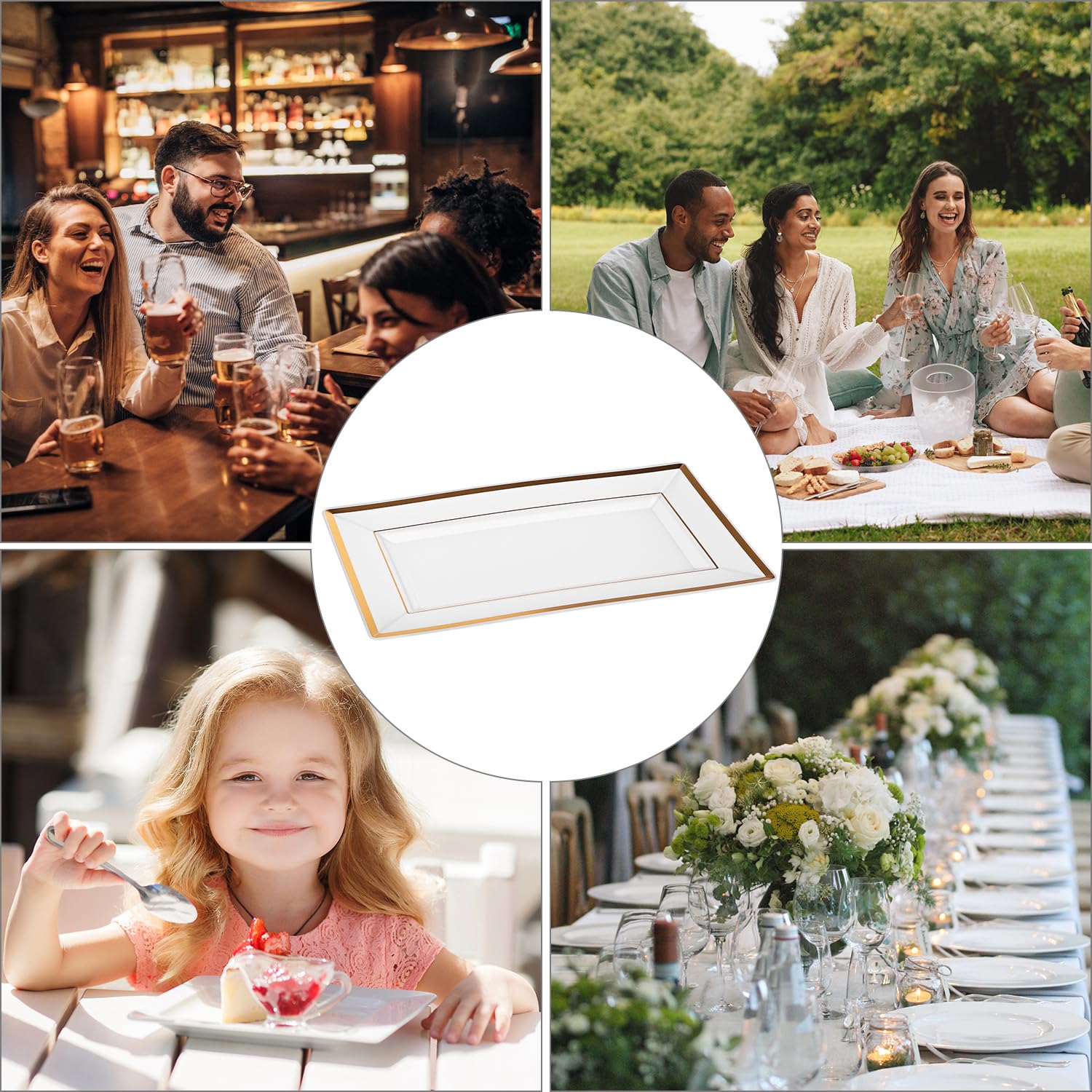 Plat De Service MAONAME Lot De 12 Assiettes Rondes Dorées De 33 Cm Pour Assiettes à Dîner, Chargeurs D'assiettes Avec Bord Perlé, Chargeurs De Table En Plastique Pour Mariage, Fête Assiettes Réutilisables Pour Fêtes Ce lot comprend 6 assiettes, idéales pour les dîners en famille, les réceptions entre amis ou les occasions spéciales. Leur taille est parfaite pour servir une variété de plats, des entrées aux desserts Lot de 6 assiettes de service plates BANCA en porcelaine blanche Utilisations polyvalentes : parfait pour les buffets, mariages, fêtes, anniversaires et autres occasions. QWORK® Lot de 6 Assiettes de Service Blanches avec Bord Doré, 30x22 cm, Plastique, Idéales pour Pool Party, Anniversaire, Banquet, Mariage · Polypropylène · 2,9... Pratique et réutilisable : facile à nettoyer et idéal pour les plats chauds et froids. Design élégant : forme rectangulaire blanche avec un élégant bord doré. Matériau de haute qualité : fabriqué en polypropylène robuste et résistant à la chaleur. Nous simplifions les choses et nous assurons que vous obtenez le meilleur pour moins cher.