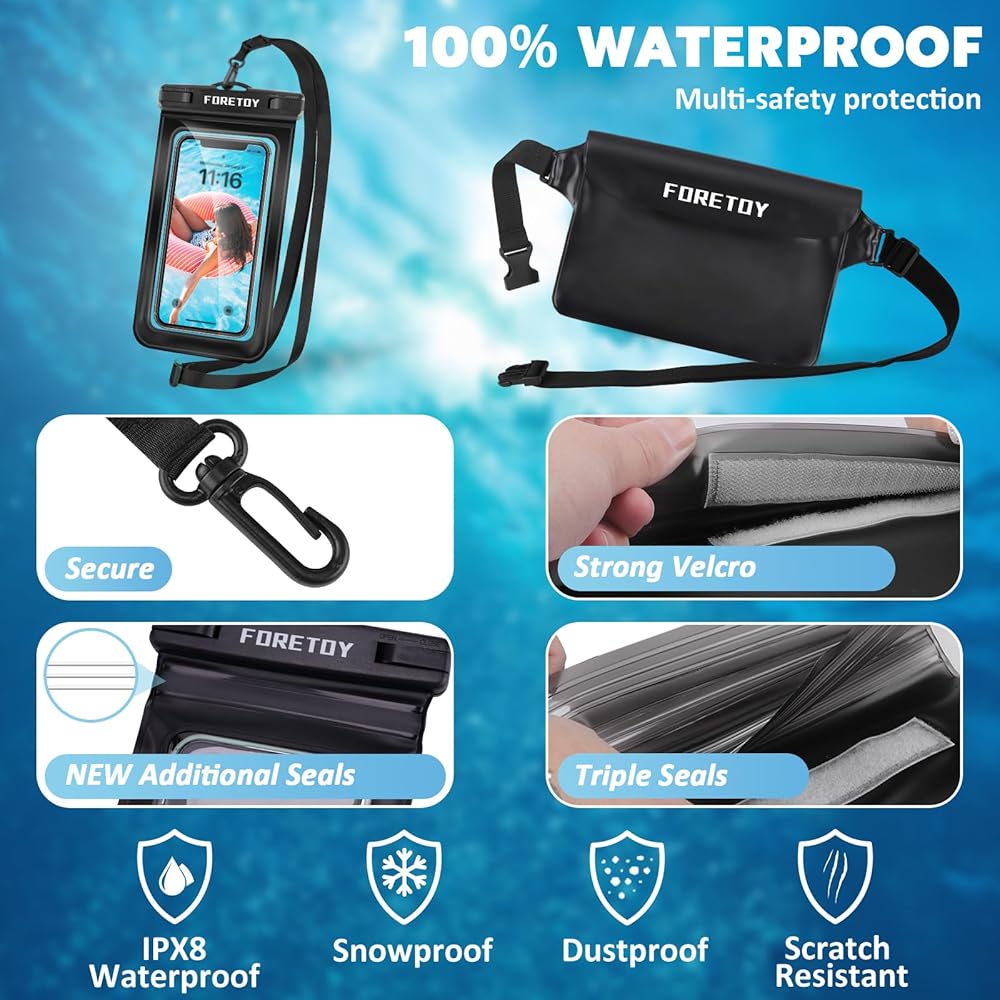 🏊♀️【Protection étanche IPX8】La pochette étanche est fabriquée en PVC imperméable, dispose de 3 couches de fermetures éclair scellées et de Velcro, et a un indice d'étanchéité IPX8., Que vous soyez à la plage ou que vous pratiquiez des sports nautiques, vous pouvez être rassuré. Ce sac pochette étanche est conçu avec une gamme de fonctionnalités uniques pour répondre à tous vos besoins, ce qui en fait un compagnon essentiel pour les activités de plein air et les voyages. -La pochette étanche bénéficie d'une impressionnante certification d'étanchéité IPX8, le plus haut niveau de protection contre l'eau, la poussière et le sable. Nous vous fournirons activement des solutions et promettons de vous apporter un service 100 % satisfaisant., -L'une des caractéristiques les plus remarquables est son design translucide et sa fenêtre tactile. Pochette étanche pour téléphone Téléphone sac étanche écran tactile... 🏄♀️【Conception pratique】La pochette étanche bleue présente une fenêtre translucide et tactile, vous permettant d'utiliser votre téléphone sans le sortir du sac. Si vous avez des questions, n'hésitez pas à nous contacter. - Une combinaison polyvalente de sécurité et de commodité. Pochette Téléphone Fenêtre Tactile Flintronic®-eu Pochette Ceinture Militaire : étanche à Tarif Pochette étanche Ceinture En nylon 600D, il est hyper résistant, imperméable, et léger. Avec ses multiples poches (dont une à fermeture éclair et des élastiques), tu peux ranger tout ton... Malgré son design compact, ce sac offre un grand espace de rangement. Remarque : avant utilisation, vous devez mettre la serviette en papier dans un sac étanche pour un test d'étanchéité. Le sac banane est étanche jusqu'à une profondeur de 2 mètres. 🤽♂️【Ceinture réglable】 Le sac banane étanche est conçu pour le confort et la sécurité. Olycism 2 en 1 Kit Étanche Sac Étanche avec Pochette Étanche Téléphone, Etui Pochette 🏄♂️【Grand espace de rangement】La taille du sac banane étanche est : 22*15,5 cm. -Le sac banane imperméable est conçu dans un souci de confort et de sécurité, et les bretelles réglables de ce sac banane assurent un ajustement parfait à tous les types de corps., Unisexe. -Nous nous engageons à offrir aux clients une expérience d'achat agréable. Cette fenêtre translucide vous permet d'utiliser votre téléphone sans le sortir de votre sac.