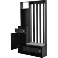 Meuble d'entrée moderne avec porte-manteau et miroir - Giloy | Mobili BANC CONFORTABLE AVEC COUSSIN : Le banc chaussures est équipé d’un coussin épais (4 cm) et large (62 cm), offrant un siège moelleux pour enfiler vos chaussures. Meuble Entrée 100x35x180cm Noir Meuble Entrée Porte-manteau Et Banc à Chaussures 2 Portes Liora Bois Rangement Couloir Meuble Fonctionnel DESIGN PERSONNALISABLE : Avec sa paroi perforée, ce portant à vêtements offre une flexibilité maximale pour organiser et exposer vos objets personnels. Meuble à chaussures avec banc, 2 portes et porte-manteau - Panneaux de... Meuble d'entrée moderne avec porte-manteau et miroir - Giloy | Mobili... Cette base surélevée facilite aussi le nettoyage et renforce l’esthétique légère du porte-vêtement. STRUCTURE STABLE ET ÉLÉVÉE : Conçu avec des pieds surélevés, ce meuble entree protège du contact direct avec l’humidité du sol. Son design épuré et moderne s’adapte à tous les intérieurs. Ce vestiaire d’entrée offre une solution intelligente pour chaque objet du quotidien. Son cadre en MDF robuste et ses ferrures solides assurent une tenue durable. ORGANISATION COMPLÈTE : Le meuble d’entrée réunit étagère, armoire fermée, 2 tiroirs, 4 crochets, banquette et espaces ouverts.