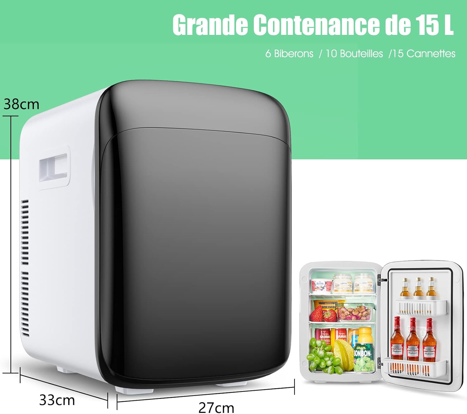 Double usage : ce petit frigo est conçu à la fois pour la conservation de la chaleur et le stockage au froid. Parfait pour la maison, la chambre, le bureau ou tout autre espace personnel. Sa taille compacte permet un placement facile et un accès pratique à vos collations et boissons préférées sans prendre beaucoup de place. Utilisation polyvalente Ce petit réfrigérateur peut être utilisé non seulement comme réfrigérateur de chambre, mais aussi dans la cuisine, dans la voiture et en camping. Mini-réfrigérateur avec fonction de chauffage de Praktikus | Angela Bruderer Il offre la commodité de garder vos boissons et collations froides ou chaudes en fonction de vos préférences. Stockage de boissons pour l'été Il s'agit d'un réfrigérateur qui vous donnera le plaisir de boire des boissons fraîches en été. Ce mini-réfrigérateur offre à la fois une conservation de la chaleur et un stockage au froid, ce qui le rend polyvalent pour divers besoins, qu'il s'agisse de... Sa polyvalence en fait un complément pratique et fonctionnel à votre quotidien. Description du produit Mini réfrigérateur Ce mini-réfrigérateur est un choix de premier ordre pour les réfrigérateurs domestiques et peut contenir des boissons, des produits cosmétiques et bien d'autres choses. Conservation et refroidissement efficaces de la chaleur : que vous souhaitiez garder vos boissons froides ou chaudes, ce mini frigo offre des capacités efficaces de conservation de la chaleur et de refroidissement. Petit Frigo Compact USB Mini Réfrigérateur Thermoélectrique De Réfrigérateur De Barre De CICO Mini Appro Frigo De Chambre Double Usage Principales caractéristiques : Chambre froide de 21 litres; Contrôle par connexion Bluetooth; Réfrigération rapide, en 10 minutes à un réfrigérateur à... Polyvalent et pratique : ce mini frigo de chambre est non seulement idéal pour conserver vos boissons et collations à la température souhaitée, mais également pour stocker des médicaments, des produits de soin de la peau, du lait maternel, etc.