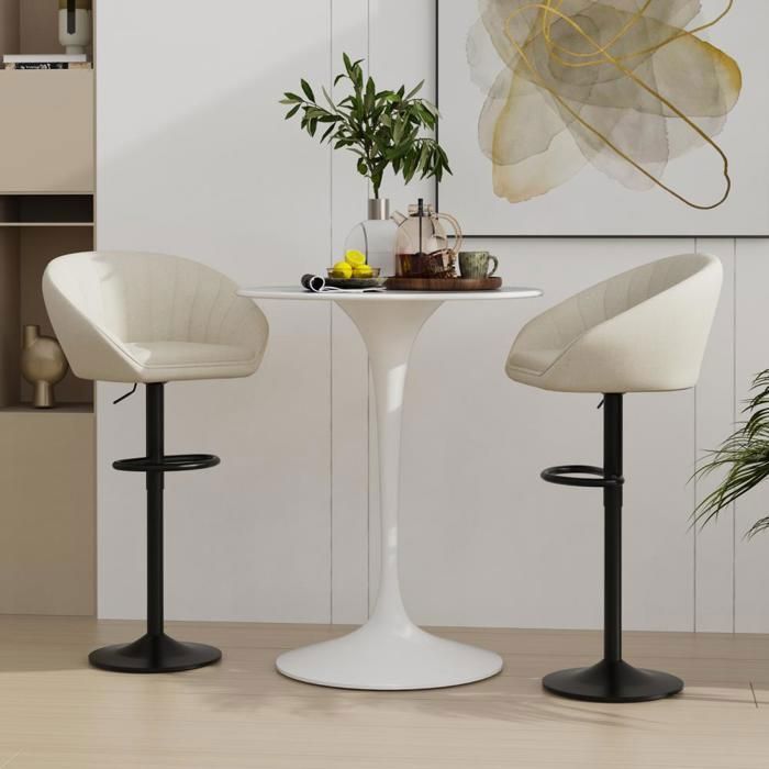 Tabourets de bar lot de 2 hauteur réglable siège pivotant blanc crème | Maisons du Monde SONGMICS Chaises de Bar, Lot de 2, Tabourets Hauts, Hauteur Réglable, Revêtement en PU, Rotatif sur 360°, avec Dossier et Repose-pieds, Pied Chromé, Noir LJB64B 4,3 (9,1 k) Plus de 50 achetés au cours du mois dernier 8999€ (45,00€/unité Tabourets De Bar , Lot De 2, Chaise De Cuisine, Siège Pivotant à Hauteur Réglable, Avec Dossier Et Repose-Pieds, Salle à Manger, Comptoir, Acier, Blanc Tabouret Bar Pivotant 【Matériaux Haut de Gamme】Fabriqué à partir de mousse haute densité et de velours doux haut de gamme, ce tabouret de bar garantit une assise confortable. 【Design Polyvalent】Avec son esthétique minimaliste et moderne, ce tabouret de bar pivotant s'harmonise parfaitement avec votre comptoir. Lot de 2 tabourets de bar pivotants, chaises réglables en hauteur avec repose-pieds pour cuisine... La base du siège est dotée d'un cadre métallique robuste pouvant supporter jusqu'à 136 kg 【Fonctionnalité Réglable】Le tabouret de bar réglable en hauteur est doté d'une conception pivotante à 360°, s'adaptant ainsi à des comptoirs de différentes hauteurs et à des utilisateurs de différentes tailles. Associé à des accoudoirs incurvés à 45 degrés qui soutiennent précisément les coudes, il offre une expérience d'assise exceptionnellement confortable Sa large base circulaire garantit stabilité, durabilité et sécurité