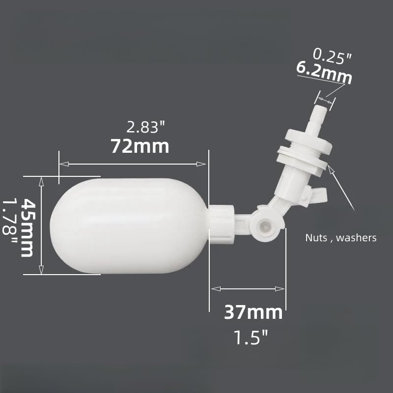 Vanne Flotteur Aquarium 6.35mm Mini Vanne à Flotteur Réglable En Plastique Pour Système D'osmose Vanne Arrêt Eau Aquarium MING vanne à flotteur d'eau 1-2 pouceune version améliorée de la vanne Contrôle automatique : les vannes flottantes en plastique pour réservoir d'eau peuvent réaliser le réglage automatique du niveau d'eau élevé et du niveau... Taille : grand corps de bouteille de 73 mm, corps de la petite bouteille 55 mm (comme le montre l'image)., Pression : 0,02-0,8 MPa. Contenu de l'emballage : 1 robinet à boisseau sphérique flottant. Contrôle du niveau d'eau : robinet à boisseau sphérique à arrêt automatique de 6,35 mm conçu pour un contrôle précis du niveau d'eau dans les aquariums, les systèmes d'eau RO et les installations d'aquarium, maintenant des niveaux d'eau optimaux sans votre surveillance constante. Style : grande boule, petite boule (piston). Construction de qualité : fabriquée à partir de matériau PP de qualité alimentaire résistant aux produits chimiques et durable, cette vanne à flotteur fonctionne de manière fiable dans des conditions de pression de 0,02 à 0,8 MPa tout en se connectant sans problème à un tube OD standard de 6,35 mm. Deux options de style : choisissez entre une grande boule (corps de bouteille de 73 mm) ou une petite boule/piston (corps de bouteille de 55 mm) pour s'adapter aux différentes exigences d'espace et aux préférences esthétiques dans votre aquarium ou système RO. Large application : compatible avec les systèmes d'osmose inverse, les aquariums de poissons, les purificateurs d'eau et d'autres scénarios de contrôle du niveau de liquide nécessitant une régulation automatique – prévention des incidents de débordement tout en maintenant des niveaux d'eau constants pour des environnements aquatiques sains. Maintenez le niveau d'eau de votre aquarium toujours stable avec cette vanne à flotteur 1/4 AutoAqua, simple et autonome