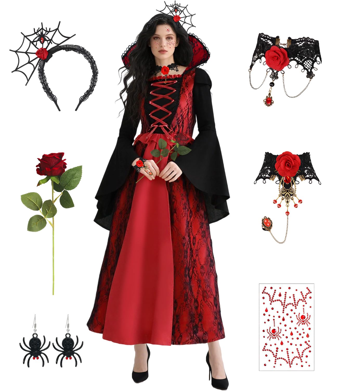 Accessoires Vampire Dents Masque Déguisement Vampire Femme Rouge Et Noir Halloween Deguisement Vampire Halloween Femme Déguisement vampire baroque luxe femme Halloween Portrait De Belle Jeune Femme En Costume Médiéval Isolé Sur Fond Blanc... Adaptation Multi-Tailles : Disponible en cinq tailles différentes, cette robe longue bicolore (noir et rouge) s'ajuste aux diverses morphologies. Sa capuche ajustable et ses lacets au buste garantissent une silhouette spectaculaire. Esthétique Mystico-Historique : Fusion subtile de l'élégance médiévale et de touches vampiriques, rehaussée par une broderie raffinée, une coupe vintage et une capuche distinctive. Ensemble Complet Vampiresque : Cette tenue inclut une robe élégante, des gants ajourés, 2 prothèses dentaires, un masque aux motifs de chauve-souris et des tatouages temporaires. Un design qui vous place au cœur de l'attention lors de fêtes ou jeux de rôle. Les finitions méticuleuses mettent en valeur une texture haut de gamme et une excellente tenue. Polyvalence Festive : Parfait pour Halloween, cosplay, représentations théâtrales ou soirées à thème. Bouche Vampire Avec Les Dents Effrayante Monstre Masque De Sourire...