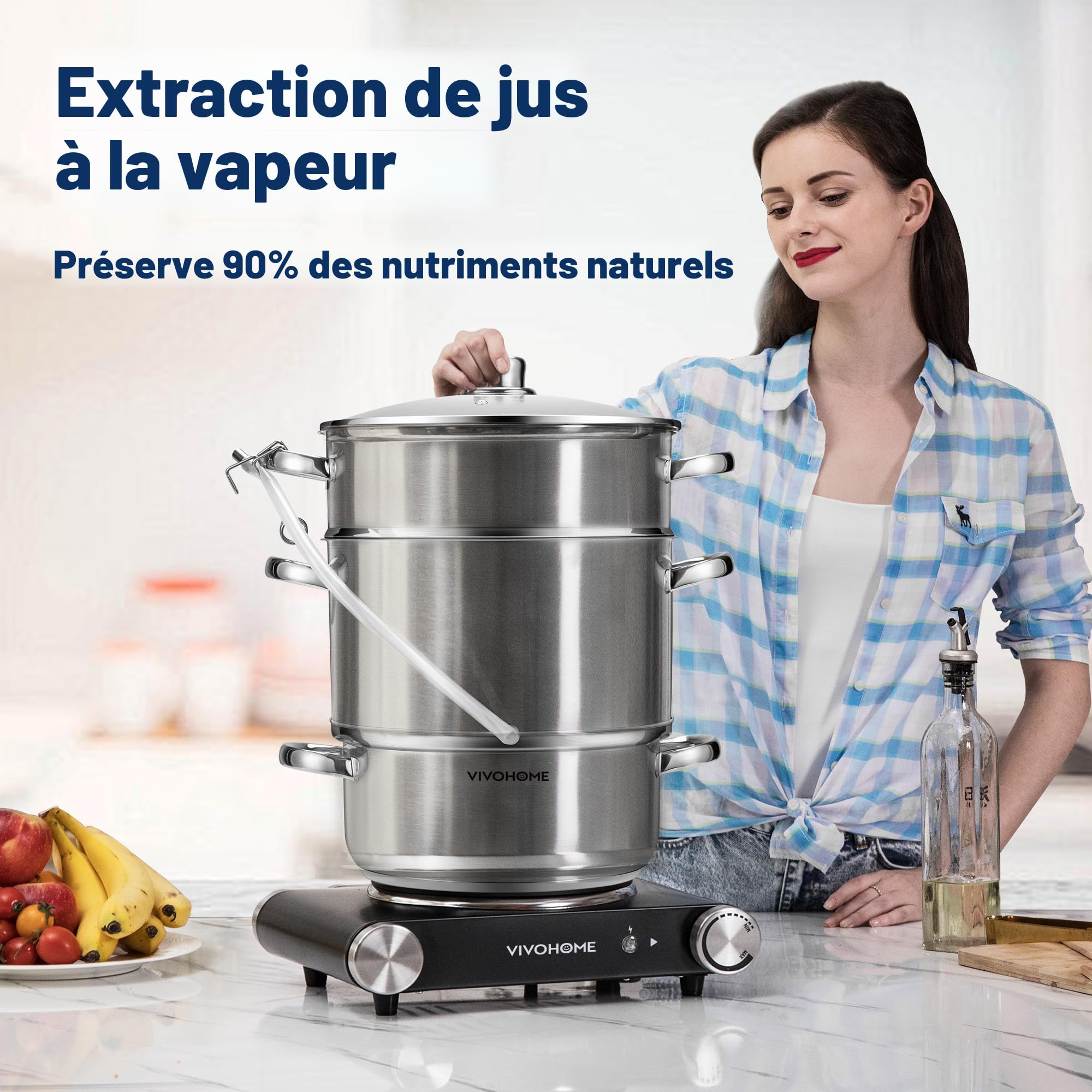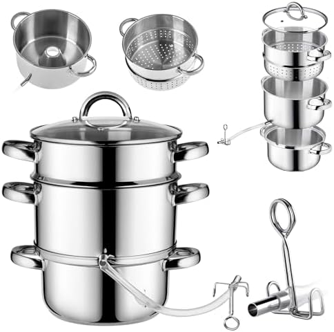 UTILISATION PRATIQUE: L'extracteur de jus vapeur est équipé d'un tuyau et d'une pince, simplifiant l'extraction du jus. La couche intermédiaire peut également contenir jusqu'à 10 L pour extraire le jus ou cuire à la vapeur une grande quantité de fruits et de légumes. Deshydrateur Alimentaire VIVOHOME Centrifugeuse à Vapeur En Acier Inoxydable Pour Fruits Et Légumes Centrifugeuse Marmite 9 L Avec Couvercle En Verre Trempé Adaptée Aux Feux à Induction Appareil Jus Maison Fruits Légumes Centrifugeuse De Fruits Et Légumes 2L 1000W Avec Verseuse 1.25L... La cuve inférieure peut contenir jusqu'à 6 L. Sa conception à 3 niveaux indépendants vous offrira une expérience culinaire exceptionnelle, à vous et à votre famille ! Un disque en aluminium à la base, entre les couches d'acier, assure une répartition uniforme et rapide de la chaleur, préservant ainsi le goût et les valeurs nutritionnelles Son utilisation est très simple et permet de réaliser des économies considérables sans risque de presser ni de faire couler le jus UTILISATION MULTIFONCTIONNELLE: L'extracteur de jus vapeur est doté de trois cuves pouvant être utilisées séparément. MATÉRIAU DE QUALITÉ SUPÉRIEURE: Ce presse-agrumes vapeur est fabriqué en acier inoxydable de qualité alimentaire, hygiénique et résistant à la déformation. Une fois le jus prêt, vous pouvez facilement le verser dans des bouteilles grâce au tuyau, la pince offrant un contrôle précis pour éviter les déversements Les poignées soudées en acier inoxydable robuste préviennent les brûlures, facilitant ainsi la cuisson. Extracteur De Jus À Vapeur Cuiseur-vapeur Centrifugeuse En Acier Inox... Grâce à la passoire supérieure et à la cuve inférieure, vous pouvez cuire vos aliments préférés à la vapeur. L'extracteur de jus vapeur pour conserves est compatible avec tous les types de cuisinières: gaz, électriques, vitrocéramiques et induction. Le couvercle est en verre trempé de 4 mm d'épaisseur et les bords sont protégés par de l'acier inoxydable. Centrifugeuse Extracteur de Jus Fruits et Légumes , 400W Récipient