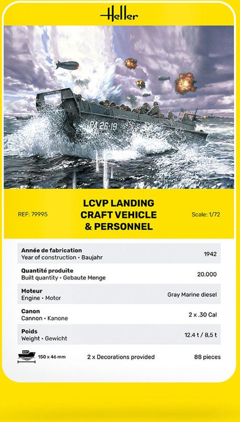 Véhicule de débarquement Heller LCVP et personnel - kit 1:72 · Modelsport 96 m Poids à vide: 8,5 tonnes Poids total en charge : 12,4 tonnesMoteur : Gray Marine diesel 6 cylindres de 225 CV Vitesse en charge : 9 à 12 nœuds Armement : 2 mitrailleuses de 12., 7 mmÉquipage : pilote, mécanicien et matelotCapacité : 36 hommes équipésou un véhicule de 2 700 kgou 3 700 kg de ravitaillementAutonomie : environ 200 km à 9 nœuds Avertissement De Sûreté Ne convient pas aux enfants de moins de 3 ans. Maquette Avion Péniche Landing Craft Véhicule & Personnel LCVP 1/72ème Réf 79995 Modèle Militaire 1/72 à Assembler ( également appelés Higgins Boat, du nom de leur concepteur et constructeur ) pouvaient transporter un peloton de 36 hommes équipés, ou une jeep et 12 hommes. Le Débarquement, la plus grande opération navale de tous les temps qui a rassemblé plus de 5 000 navires de tous types, n’aurait pu avoir lieu sans les Landing Craft Vehicle and Personal, petits bâtiments taillés à la serpe, dont les lignes révélaient l’usage précis auquel ils étaient destinés Maquette LCVP landing Craft et personnel, 2emeGM chez francis... <li><b>Description du produit</b>: Maquette plastique à assembler du véhicule militaire le LCVP (Landing Craft Vehicle Personal) au 1/72ème., 86 pièces. Contenu du coffret Maquette Dimension modèle monté = 150 x 46 mm</li> , </ul> - également appelés Higgins Boat, du nom de leur concepteur et constructeur pouvaient transporter un peloton de 36 hommes équipés, ou une jeep et 12 hommes. 1 planche de décalcomanie , Plan de montage, <ul> Description du produit Le Débarquement, la plus grande opération navale de tous les temps qui a rassemblé plus de 5 000 navires de tous types, n'aurait pu avoir lieu sans les Landing Craft Vehicle and Personal, petits bâtiments taillés à la serpe, dont les lignes révélaient l'usage précis auquel ils étaient destinés: s'échouer sur les plages et faire débarquer rapidement les forces d'assaut par la rampe mobile de l'avant, se déséchouer le plus rapidement possible pour repartir chercher troupes et/ou approvisionnements.