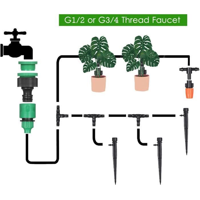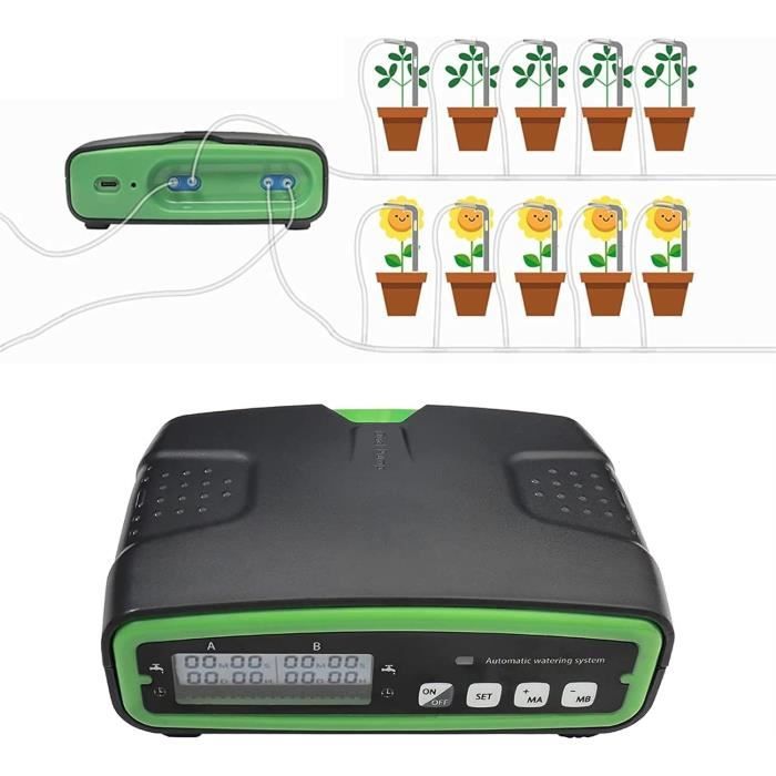 Système D'arrosage Gratuit Système D'irrigation De Jardin à Double Pompe - Jardin & Plantes Arrosage Automatique Double Pompe Arrosage Automatique Goutte à Goutte Double Pompe 30 Jours Système WADEO Kit D'arrosage Automatique, Système D'irrigation de Jardin à Double Pompe, avec Tuyau D'irrigation Goutte à Goutte de 10 m, avec Goutteurs Réglables, Minuterie Programmable et Fonctionnement Les tubes s'enlèvent-ils facilement ? Les tubes se détachent généralement parce qu'ils ne sont pas insérés de manière étanche et doivent être ébouillantés avec de l'eau chaude et le tube inséré jusqu'au fond. Cet abreuvoir automatique fonctionne-t-il sur courant continu ou sur piles ? Nos abreuvoirs peuvent être branchés ou alimentés par des piles. Il est généralement recommandé de les brancher, les piles n'étant qu'une solution de secours en cas de panne de courant. Quelle est la longueur du cordon d'alimentation de cet abreuvoir automatique ? Le câble d'alimentation de notre abreuvoir mesure 1,2 mètre de long et peut également être utilisé avec des piles, bien que l'alimentation en courant continu soit préférable. Les pompes robustes fournissent un débit d'eau suffisant pour arroser un plus grand nombre de plantes, ce qui le rend idéal pour une utilisation à la maison ou en serre. La minuterie intelligente vous permet d'établir des cycles d'arrosage, offrant ainsi une tranquillité d'esprit grâce à une solution intelligente et écologique qui économise l'eau et favorise la croissance des plantes. Définissez votre plan d'arrosage pour chaque pompe et laissez le distributeur automatique s'occuper du reste, ce qui est parfait pour maintenir la santé de vos plantes pendant votre absence. Personnalisez la dur e d'arrosage de 0 99 secondes ou de 2 99 minutes et les intervalles de 1 23 heures ou de 1 30 jours, afin d'assurer une hydratation pr cise pour un maximum de 15 plantes en pot