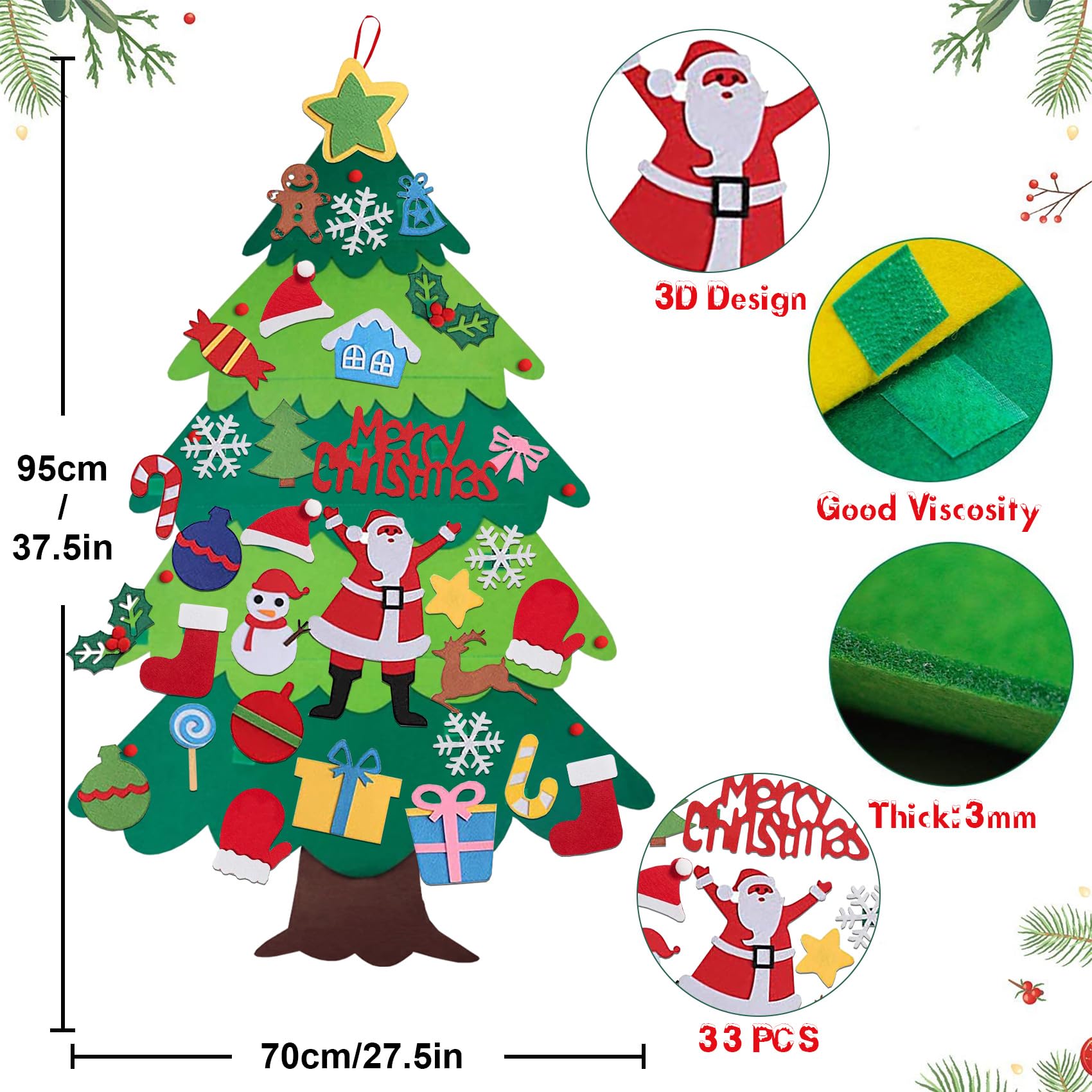 ou le coller sur le sapin de Noël, ce qui est très pratique et facile à utiliser. FUNNING-Feutre Arbre de Noël Bricolage Sapin de Noël Feutrine 32pcs Décorations Détachables 33ft [Largement appliqué] L'arbre de Noël pour enfants est conçu avec une large applicabilité, il enfants pour jouer sur les murs, les portes, les fenêtres, les salles de classe, les salons et les chambres, et convient à toutes sortes de fêtes de vacances. [Meilleur cadeau pour les enfants] Le sapin de Noël en feutre pour enfants est conçu avec des décorations détachables de différentes couleurs et formes, telles que des cannes de bonbon, le père Noël et des bonhommes de neige, ce n'est pas seulement amusant pour les enfants, mais aussi une décoration de la maison pour Noël, et un grand cadeau. Activite Parent Enfant Bricolage Noel Diy Feutre Arbre De Noël,Sapin De Noël En Feutrine Pour Enfant, Ensemble D'Arbre De Noël En Sapin De Noel Bebe [Utilisation facile] Le sapin de Noël en feutre est conçu avec une boucle de longe, vous pouvez l'portes, fenêtres, murs, etc. [Matériaux de qualité supérieure] L'arbre de Noël en feutre pour enfants est fabriqué en feutre de haute qualité, il utilise un autocollant double face, qui est fermement collé et sans odeur, améliore la créativité des enfants et cultive leur capacité pratique, durable.