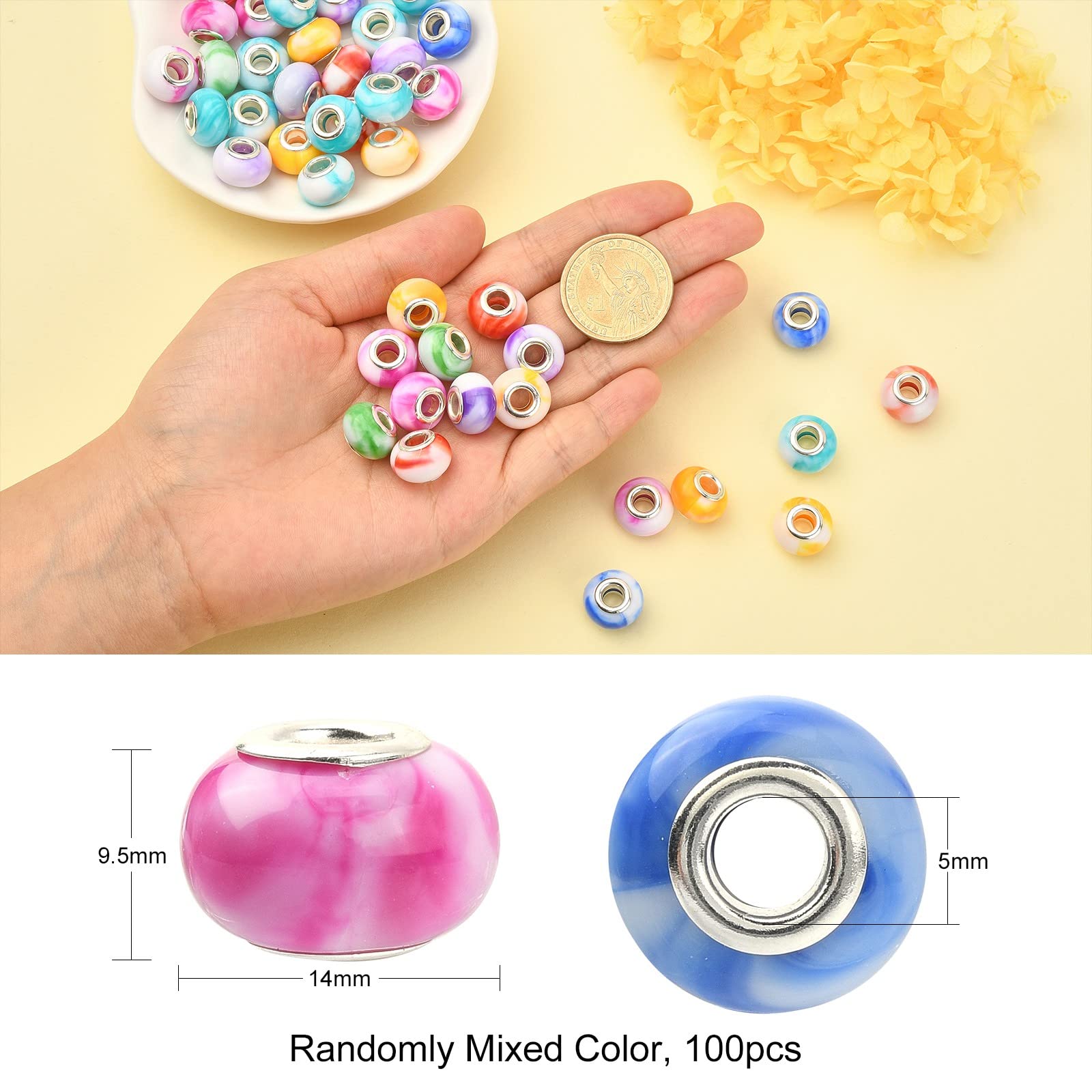 Rondelle vert jaune porcelaine fait main grand trou perles européennes en gros pour création de Matériau : véritables perles en pierre naturelle multicolores, excellent polissage, surface lisse, couleur vive. Les perles en pierre sont conformes aux... Perles 14mm Trou 5mm UR URLIFEHALL 100pcs Mélange Aléatoire De Couleur Plaqué Porcelaine Perles Résine Grand Trou 👍 Matériel: ces perles européennes à grand trou sont faites de matériau résineux avec un noyau en laiton argenté et ont une forme ronde. 👍 Grands trous: il y a de grands trous, ils sont compatibles avec les chaînes capricieuses, les chaînes de serpent, les lacets en cuir larges et les cordes de chanvre, les bandes de tissu tissé, les cordes de fibres et autres matériaux de câblage de plus grand diamètre. Taille: toutes les perles européennes ont un diamètre d'environ 11 mm, une épaisseur de 5,5 mm, un trou de 5 mm, environ 1330 grains / 500 G. Il y a un... Perles étincelantes, simples et élégantes, robustes et durables, idéales pour faire des bracelets de vos propres mains et une utilisation à long terme. 👍 Large utilisation: ces perles de grand trou sont simples, élégantes et accrocheuses, idéales pour les adolescents et les adultes, le port quotidien, les fêtes, le surf et d'autres occasions. 👍 Idéal pour les cadeaux: utilisez ces perles d'espacement européennes pour faire des bijoux uniques DIY, des bracelets, des colliers, des boucles d'oreilles et plus de cadeaux faits à la main pour vos amis, vos proches et vous - même pendant les fêtes de Noël, d'anniversaire, de Saint - Valentin, de fête des mères, de Thanksgiving, etc. Convient pour toutes sortes de bricolage artisanat, tels que bracelets, colliers, Perles, boucles d'oreilles, robes, accessoires et autres bijoux artisanat