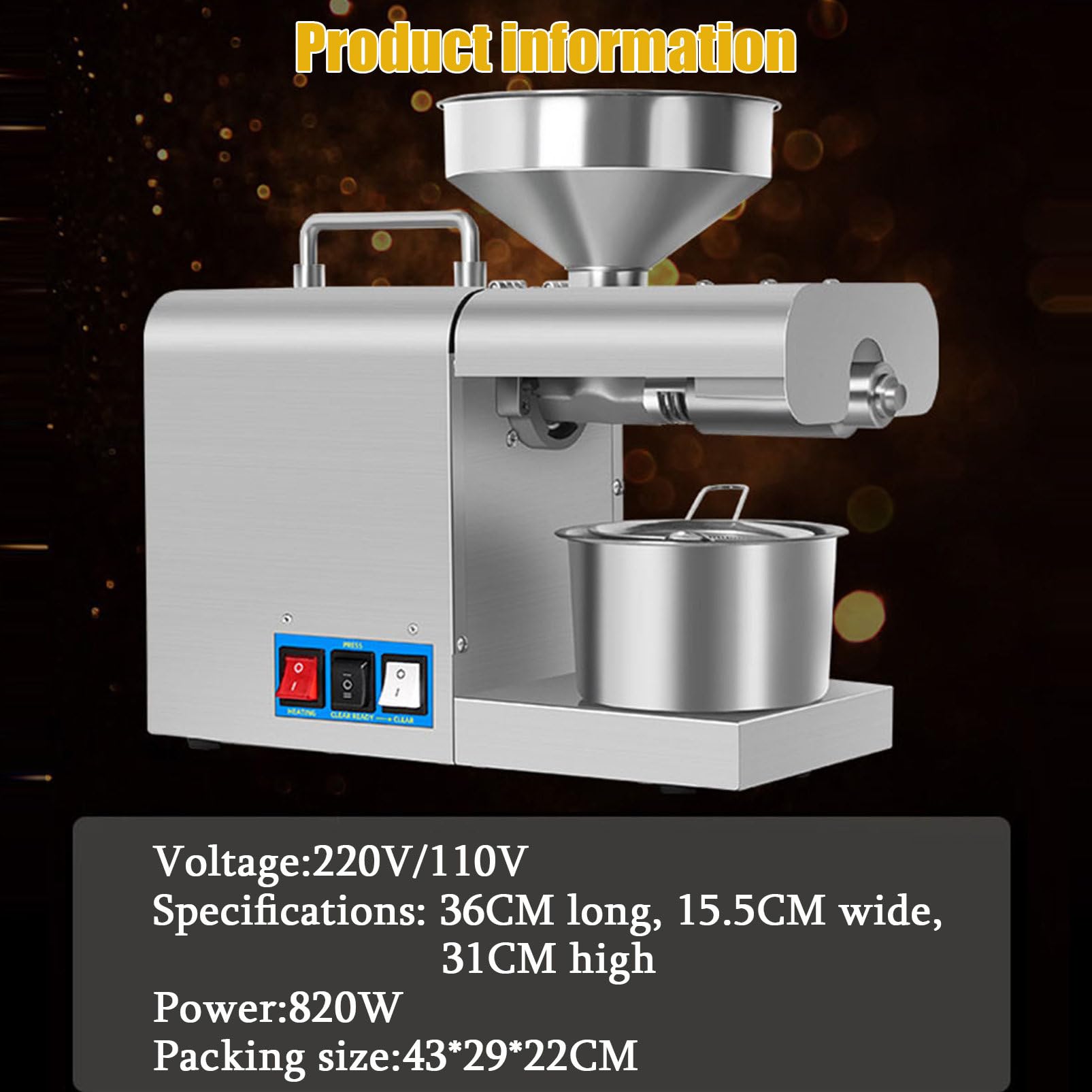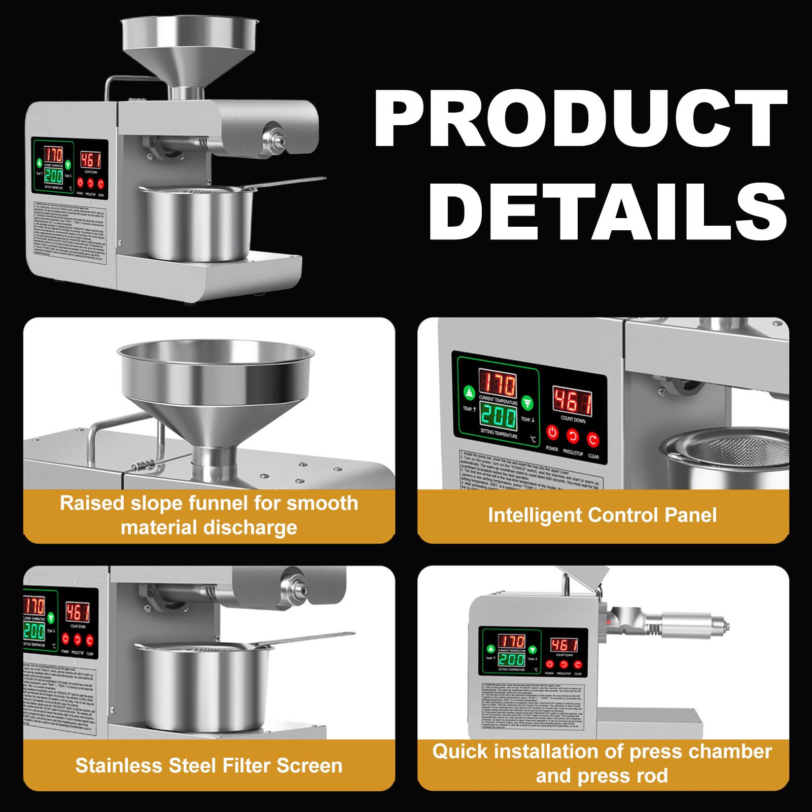 Les bords sont polis pour éviter les coupures Son rendement est de 3 à 6 kg/h (6,61 à 13,22 lb/h), sa consommation d'énergie est de 0,6 kWh par heure et ses dimensions sont compactes (43,5 × 32 × 15 cm) Machine Huile Végétale Maison YORCME Pressoir à Huile Électrique 820W, Extracteur D'Huile Biologique Presse Huile à Froid 820W Extracteur d'huile manuel - Shipenophy - 9L - Métal, plastique - Tuyau en cuivre - Universel... 【Rendement d'huile élevé 】: Équipée d'une tige de pressage innovante qui extrait l'huile plus efficacement, avec moins de résidus, améliorant le rendement jusqu'à 60 %. Envie d'une huile de cuisson saine et sans danger ? Cette presse à huile est faite pour vous. 【Presse à huile haute puissance 820 W】 : Dotée d'un moteur en cuivre pur et d'un contrôle intelligent de la température, elle est réglable de 40 à 300 °C (104 à 572 °F). L'huile pressée à froid conserve davantage de nutriments, tandis que l'huile pressée à chaud offre plus d'arômes et de volume 【Matériau en acier inoxydable】 : La presse à huile est fabriquée en acier inoxydable 304 de qualité alimentaire et est livrée avec un corps en acier inoxydable. ▶︎【Caractéristiques】✅ Presse à huile haute efficacité : Équipée d'un puissant moteur de 820 watts, elle peut produire de 3 à 6 kg d'huile par heure. 【Système de refroidissement amélioré】Conçu avec une dissipation thermique multidirectionnelle à l'arrière, en dessous et sur les côtés pour éviter la surchauffe, il permet un fonctionnement continu 24 heures sur 24 en toute sécurité ▶︎【Caractéristiques】- Nom du produit : Presse à huile domestique- Matériau : Acier inoxydable- Tension : 220 V/110 V- Puissance : 820 W- Méthode de pressage : Pressage à froid, Pressage à chaud- Rendement en huile : Jusqu'à 60 %- Vitesse de pressage : 3 à 6 kg par heure (arachides)- Autonomie : 24 heures en continu- Puissance Consommation : 0,6 kWh- Niveau sonore : ≤ 70 dB(A)- Dimensions : 43,5 x 32 x 15 cm- Poids brut : 8 kg▶︎【Contenu de l'emballage】- Presse à huile x 1- Récipient de récupération d'huile x 1- Filtre x 1- Trémie x 1- Coude de guidage des scories x 1- Chambre de pressage x 1- Barre de pressage x 1- Gants isolant x 1- Brosse de nettoyage x 1- Cordon d'alimentation x 1- Manuel d'utilisation x 1▶︎【Remarque】- Ne convient pas au pressage direct des olives, des avocats ou des noix. Pressoir à olives L'acier inoxydable est durable et facile à nettoyer. 【Double mode de pressage à froid et à chaud】L'extracteur d'huile prend en charge le pressage à froid et à chaud de différentes huiles. Protection contre la surchauffe et la surcharge pour un fonctionnement optimal. VEVOR Pressoir à Vin Manuel 3,5 L Presse Fruits 2 Barils Inox Presseur Extracteur de Jus