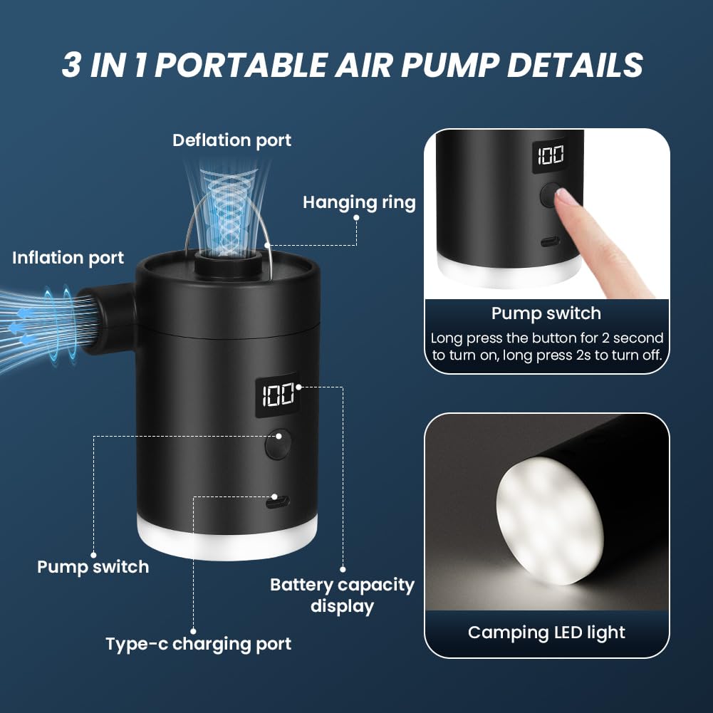 Elle peut gonfler matelas, piscines, matelas à eau, bouées, jouets de plage et autres objets gonflables. Gonfleur Matelas Pompe À Air Électrique, Mini Pompes Air Électriques Portables Usb Gonfleur Electrique Gonflage et dégonflage efficaces : La pompe à air électrique est équipée d'une pompe à double moteur, pour des opérations de gonflage et de dégonflage simples et efficaces. ZVD Gonfleur Matelas Gonflable, Pompes à Air Electriques Gonfleur... Portable et légère : Cette pompe à air portable est petite et légère, et peut être facilement transportée partout. Sa portabilité la rend facile à utiliser à l'intérieur comme à l'extérieur, et vous permet de l'emporter partout avec vous. Pompe À Air Électrique Gonfleur Dégonfleur, Mini Pompe À Matelas D'Air... L'écran LED indique le niveau de charge de la batterie pour une surveillance et une gestion faciles. La pression d'air élevée et le débit d'air important permettent un gonflage rapide, réduisent le temps d'attente et vous permettent de jouer ou de vous détendre plus librement. Son crochet intégré permet de l'accrocher facilement à la tente, ce qui est idéal pour le camping ou les voyages. 3T6B Pompe à Air électrique sans Fil Rechargeable,4000 mAh Gonflage Batterie haute capacité et écran LED : La pompe à air est équipée d'une batterie intégrée de 4 000 mAh offrant une autonomie prolongée. Éclairage de camping : Outre sa puissante fonction de gonflage, elle intègre une lampe de camping pratique avec une large plage d'éclairage, une luminosité élevée et un réglage de la luminosité à deux vitesses.