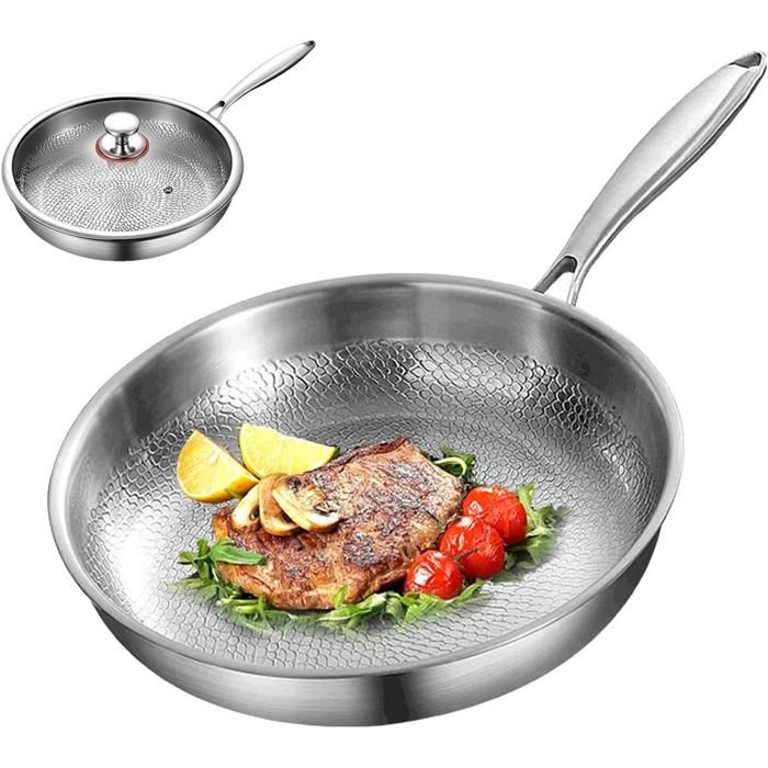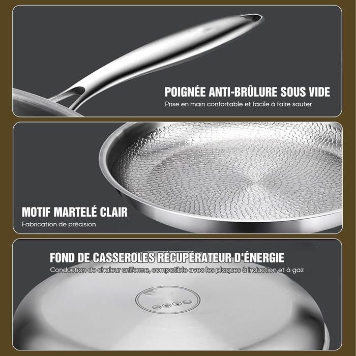 30 cm Utilisable sur : cuisinières à gaz, à induction, électriques, vitrocéramiques, etc. Couvercle Poêle Titane Poêle Électrique Poêles À Frire Électriques Antiadhésives Pour La Cuisson Multicuiseur Poêle En Titane Pour Cuisine 【Légère Mais Robuste】 Notre poêle Titanium Pro est 30 % plus légère que l'acier inoxydable, tout en étant suffisamment robuste pour supporter des ustensiles en métal. 【Conçue pour Durer Toute Une Vie】 La poêle en titane est fabriquée à 100 % en titane pur, ce qui lui confère une résistance à la déformation, à l'écaillage et à la rouille. 【Naturellement Antiadhésif, Sans Revêtement】 La surface martelée de cette poêle en titane permet aux aliments de glisser facilement ; aucun revêtement chimique ni écaillage. Facile à soulever, facile à utiliser et conçue pour un usage quotidien. Nos 5 Meilleures Poele En Titane en France - Janvier 2026 Matériau : Titane + acier inoxydable 304., Aluminium + acier inoxydable 430., Poids : 26 cm (sans couvercle) : 1,006 kg. L'entretien de votre poêle en titane est un jeu d'enfant. 30 cm (avec couvercle) : 1,786 kg., Dimensions : 26 cm (10,23 po)., 28 cm (11,02 po). C'est le genre d'ustensile de cuisine en titane que vous achetez une fois et que vous utilisez pendant des décennies : parfait pour la cuisine familiale quotidienne. Grâce à son design spacieux, la poêle en titane est idéale aussi bien pour un petit-déjeuner rapide que pour les grands repas de famille ou les réunions de week-end. 100 % titane pur : cette poêle à frire avec surface forgée est entièrement fabriquée en titane de haute qualité, ce qui la rend incroyablement durable, résistante à la rouille et à la déformation et à l'écaillage Ce mauvais réflexe à la poêle fait accrocher vos steaks dans toutes les poêles, même... Couleur : Couleur métal titane. 30 cm (sans couvercle) : 1,163 kg. Pour une performance optimale à long terme, nous vous recommandons de suivre les instructions d'entretien fournies. Spécifications : Nom : Poêle en titane.