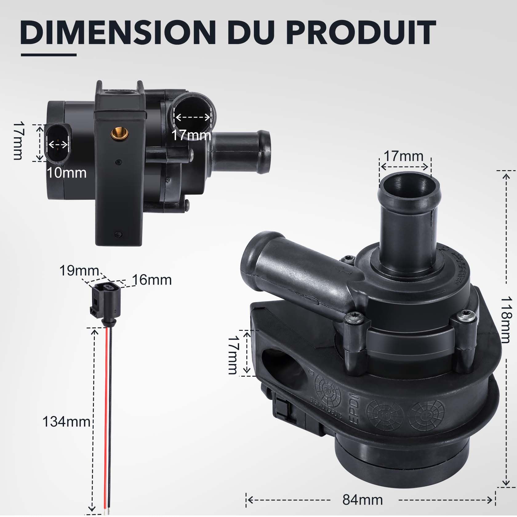 Remplacement Pompe Eau Auxiliaire Voiture Enwye Pompe à Eau Auxiliaire électronique 1K0965561J De Remplacement Pompe De Refroidissement 1K0965561J Description Cette pompe à eau auxiliaire est faite pour remplacer l'originale sur certains modèles. Référence OEM 1K0965561J. En plastique haute qualité, couleur blanc/noir, dimensions 8,3x7x11,5 cm, diamètre 2 cm, poids 335 g. Conçue pour moteurs 2.0T 2007-2013. Finition soignée, résistance à la corrosion et à l'usure. Installation directe en remplacement de l'ancienne... Bomba De Agua De Refrigeración De Automóvil 1k0965561j Auxil | Cuotas Facile à installer dans l'emplacement désigné du système de refroidissement auxiliaire en suivant les procédures automobiles standard, il fonctionne avec la pompe à eau principale pour améliorer l'efficacité globale du refroidissement pour des performances constantes. Pompe à eau de rechange automobile : OE-Nr. 1K0965561J est le remplacement parfait de la pompe à eau du système de refroidissement de la Jetta, Passat, CC, Octavia, Tiguan, Sharan, Leon, A3 et autres marques automobiles. Achetez Pompe à Eau Auxiliaire, Pièce de Rechange... Fabriquée à partir de matériaux durables pour résister aux environnements à haute température et à haute pression, cette pompe offre un fonctionnement fiable, réduisant les besoins de remplacement et garantissant une fonctionnalité à long terme. Spécifications :Numéro de modèle : 1K0965561JCompatible avec certains modèles de véhiculesTension de fonctionnement : 12 VMatériau : Thermoplastique haute résistance et composants métalliquesType d'installation : Remplacement direct de la pompe à eau auxiliaire d'origineContenu :1 pompe à eau auxiliaire électronique 1K0965561J Fonctionne comme un composant essentiel pour maintenir une température optimale du liquide de refroidissement dans des situations de charge élevée, comme après l'arrêt du moteur, contribuant ainsi à prolonger la durée de vie du système de refroidissement et des composants associés. Caractéristiques :Conçue pour répondre aux spécifications de l'industrie en matière d'ajustement précis et de performances, cette pompe à eau auxiliaire s'intègre parfaitement aux systèmes de refroidissement existants.