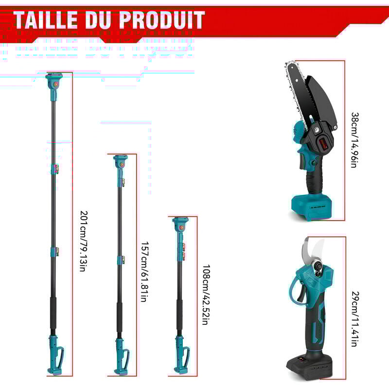 Extension élagueur Sans Fil 2m Perche élagage 2m Sécateur électrique Télescopique Ecarke - Perche 2m, Compatible Batteries Makita 18V - Coupe Branches 38mm Outil Jardinage Coupe Branches 30mm Accessoire Outil Jardin Makita 18V Sécateur électrique - PRUMYA - Sécateur sans fil - 1000W - Diamètre de... Sécateurs électriques sans fil Sécateur électrique sans fil batterie Tête réglable à 180 ° : la tête de la tige télescopique peut pivoter à 180 ° pour ajuster l'angle selon vos besoins, offrant plus de flexibilité et d'efficacité Angle réglable : la tige d'extension est équipée d'une fonction de rotation à 180 ° qui peut facilement s'adapter aux branches à différents angles, de sorte que... Lorsqu'elle n'est pas utilisée, elle peut être démontée en quatre parties et facilement rangée dans l'atelier, le garage ou dans le coffre de la voiture Contenu de la livraison : 4 tiges télescopiques La poignée antidérapante offre une prise en main confortable et stable, en particulier en cas d'humidité Caractéristiques : Nom du produit : pôle d'extension télescopique Réglage de l'angle : 0-180°., Taille : voir photo.