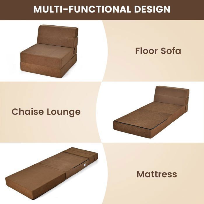 Caractéristiques : Canapé 3 en 1 pour s'adapter à tous vos besoins : chaise, lit ou canapé Dossier réglable en 6 positions répond à vos besoins quotidiens Idéal pour lire, regarder la télévision, jouer ou dormir Tissu en velours et rembourrage en mousse pour un grand confort Construction métallique solide pour une grande durabilité et stabilité 2 coussins souples pour soutenir la nuque ou les lombaires Conception pliable pour un rangement facile du canapé-lit Canapé-lit moderne et élégant pouvant s'intégrer à diverses décorations Idéal pour le bureau, le salon, la chambre à coucher ou la chambre d'amis Spécifications : Couleur : gris/gris foncé Matériau : Velours, Éponge, Métal Dimension mode canapé : 72 x 102 x 54 cm (L x l x H) Dimension mode plié : 67 x 102 x 33 cm (L x l x H) Dimension mode lit : 169 x 102 x 13 cm (L x l x H) Capacité de poids : 91 kg Poids net : 10 kg Poids brut : 12 kg Livraisons : 1 x Canapé-lit 2 x Coussin 1 x Instruction Avertissement De Sûreté Conserver loin des sources de chaleur élevées. Canapé-lit convertible 3 en 1 : Ce canapé multifonctionnel peut être rapidement converti en chaise longue ou en lit selon vos besoins, ce qui vous permet de profiter d'une variété d'espaces confortables et relaxants. Dossier réglable sur 6 niveaux : Avec un dossier réglable sur 6 positions différentes entre 95° et 180°, ce canapé-lit vous permet de vous asseoir ou de vous allonger confortablement, de détendre votre corps et de soulager votre fatigue. Rempli de mousse haute densité et recouvert d'un revêtement en velours doux au toucher, notre canapé-lit vous offre un soutien parfait pour votre corps. GOPLUS Canapé-lit Enfants Convertible-Fauteuil Rembourré en Éponge avec Surveillance des enfants et des animaux domestiques pour éviter les risques d'emprisonnement. Profitez de son dossier réglable sur 6 positions, pour vous installer confortablement en position assise ou allongée, et savourer un moment de relaxation inégalé. Fauteuil pliable canapé convertible, dossier réglable 6 positions, avec... Il sera le lieu de repos idéal pour différentes scènes dans le salon, la chambre à coucher, le bureau et plus encore. Transformable en un clin d'œil en fauteuil de détente ou en lit douillet, il s'adapte à vos besoins pour vous offrir un espace reposant à souhait. De plus, sa conception pliable le rend peu encombrant, facile à ranger et à transporter. Canape Convertible GOPLUS Canapé-lit Enfants Convertible-Fauteuil Rembourré En Éponge Avec Dossier Et Accoudoirs Canapé Lit Pliable Mode lit : Position complètement allongée (187 cm de longueur), offrant un espace de couchage confortable pour une personne - résout le problème du couchage dans des studios, des chambres à coucher petites ou des appartements étudiants Vous pouvez lire, regarder la télévision, jouer, travailler ou vous reposer en tout confort.