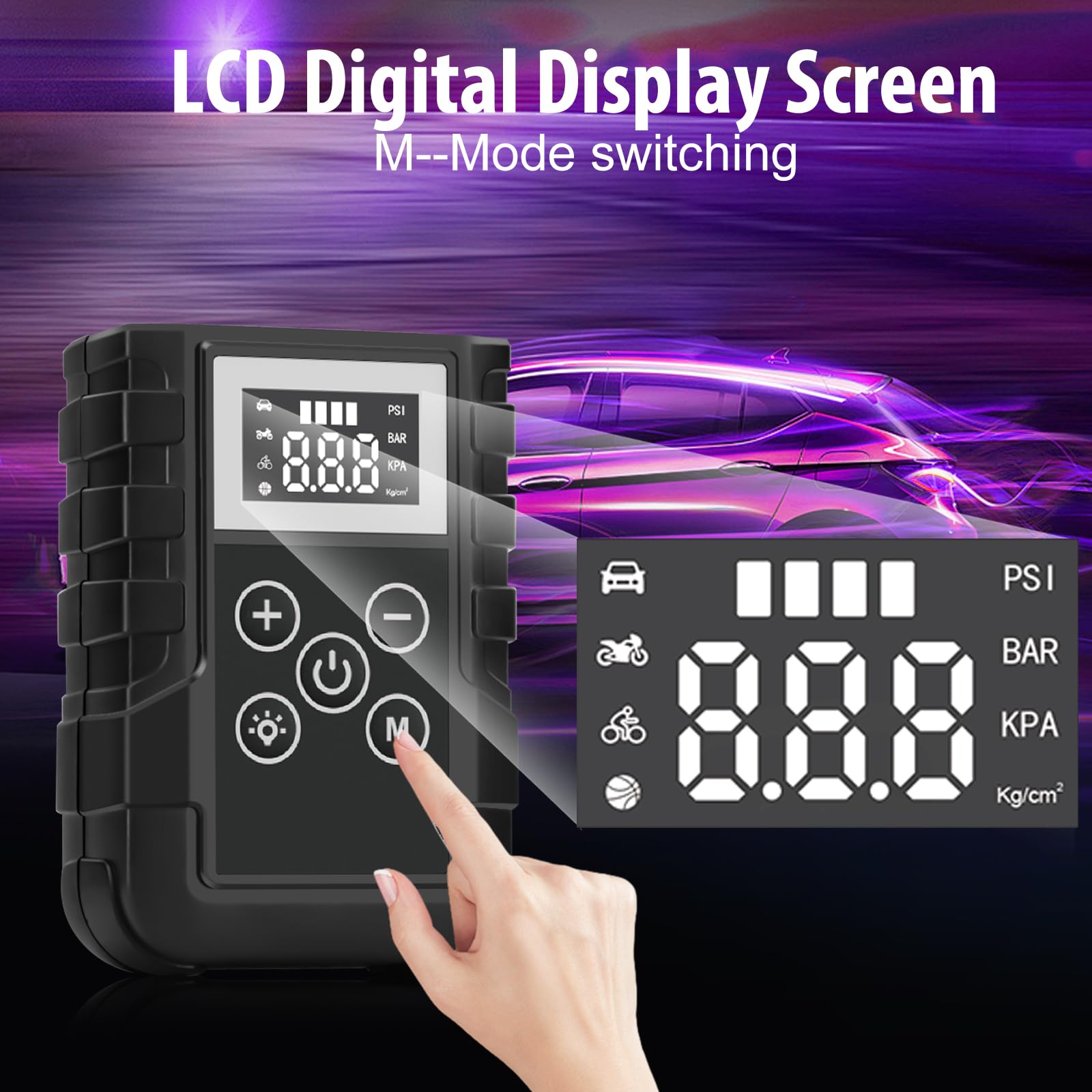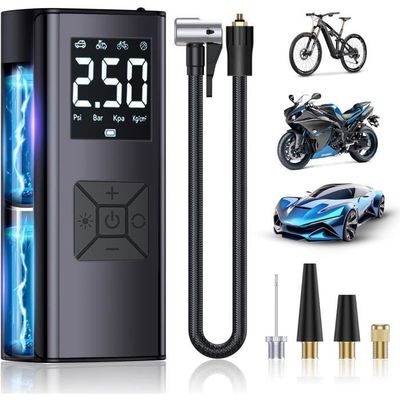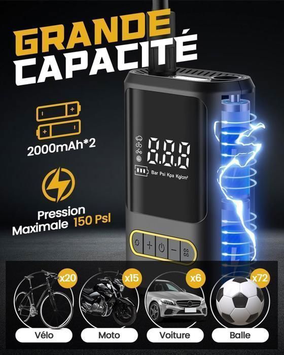 4 unités (PSI, BAR, KPA, KG/CM²) interchangeables selon les standards internationaux. Simultanément, l'écran LED affiche la pression en temps réel pour un contrôle total du processus de gonflage. 【Équipement Polyvalent】Le port de sortie USB-A situé sur le dessus du pompe vélo electrique sert de source d'alimentation de secours pour les téléphones portables. 【5 IN 1 Mode & HD LED Écran】Ce gonfleur vélo electrique dispose de 5 modes de gonflage (voiture, moto, vélo, ballon, personnalisé) pour différents besoins. Gonfleur de pneu portable 150 psi, pompe à vélo électrique portable Grand écran LED lisible même dans l'obscurité pour surveiller la pression en temps réel. Avec son cylindre haute précision en alliage d'aluminium, elle atteint une pression maximale de 150 PSI/10,3 bar et gonfle un pneu de voiture de 28 à 36 PSI en seulement 1 min. Gonfleur Pneu Velo, 150Psl,6000Mah,Sans Fil Et Portatif, Compresseur Pneu Avec Éclairage Led... Buse métallique recouverte de silicone contre les brûlures. 【6000mAh Batterie & Gonflage Rapide】2025 Lamicall compresseur à air portatif pour voiture est équipée d'une batterie 6000 mAh offrant une autonomie étendue. Les cyclistes novices comme expérimentés peuvent utiliser ce gonfleur en toute sécurité et sans effort. Pompe Pour Vtt Ompe À Vélo Électrique 6000Mah Pompe À Air Électrique, Compresseur D Pompe De Secours Usb Mon avis sur ce produit Le Lamicall Gonfleur Pneu Voiture est un indispensable pour quiconque recherche un compresseur d'air compact et portable. Sa facilité d'utilisation m'a tout de suite séduite, avec un écran LCD affichant clairement les données essentielles et un système d'arrêt automatique pour éviter le surgonflage. Ce petit bijou est aussi polyvalent qu'efficace... Équipé de 3 buses pour gonfler voitures, motos, vélos, ballons et autres équipements.