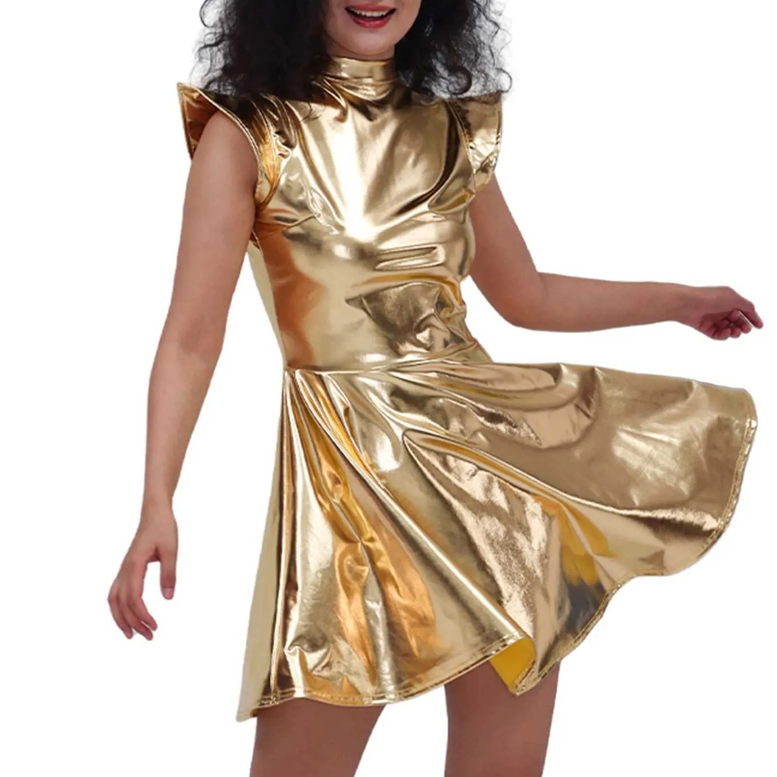 ÉCLAT URBAIN & DESIGN HOLOGRAPHIQUE : Cette robe à col roulé plissé, aux reflets métalliques dorés ou argentés, capte la lumière avec une élégance raffinée... Robe de soirée A-ligne col en cœur longueur au sol manches courtes... Tenue Reveillon Femme Robe Mi-longue Argentée Métallisée à Bretelles Asymétriques | FR Paillettes Vetement Femme Tenue Rave Femme Robe Métallisée Holographique Sans Manches Pour Femme - Style Clubwear, Festival, Cosplay - Taille Haute Et Courte Robe Sans Manches Sexy
