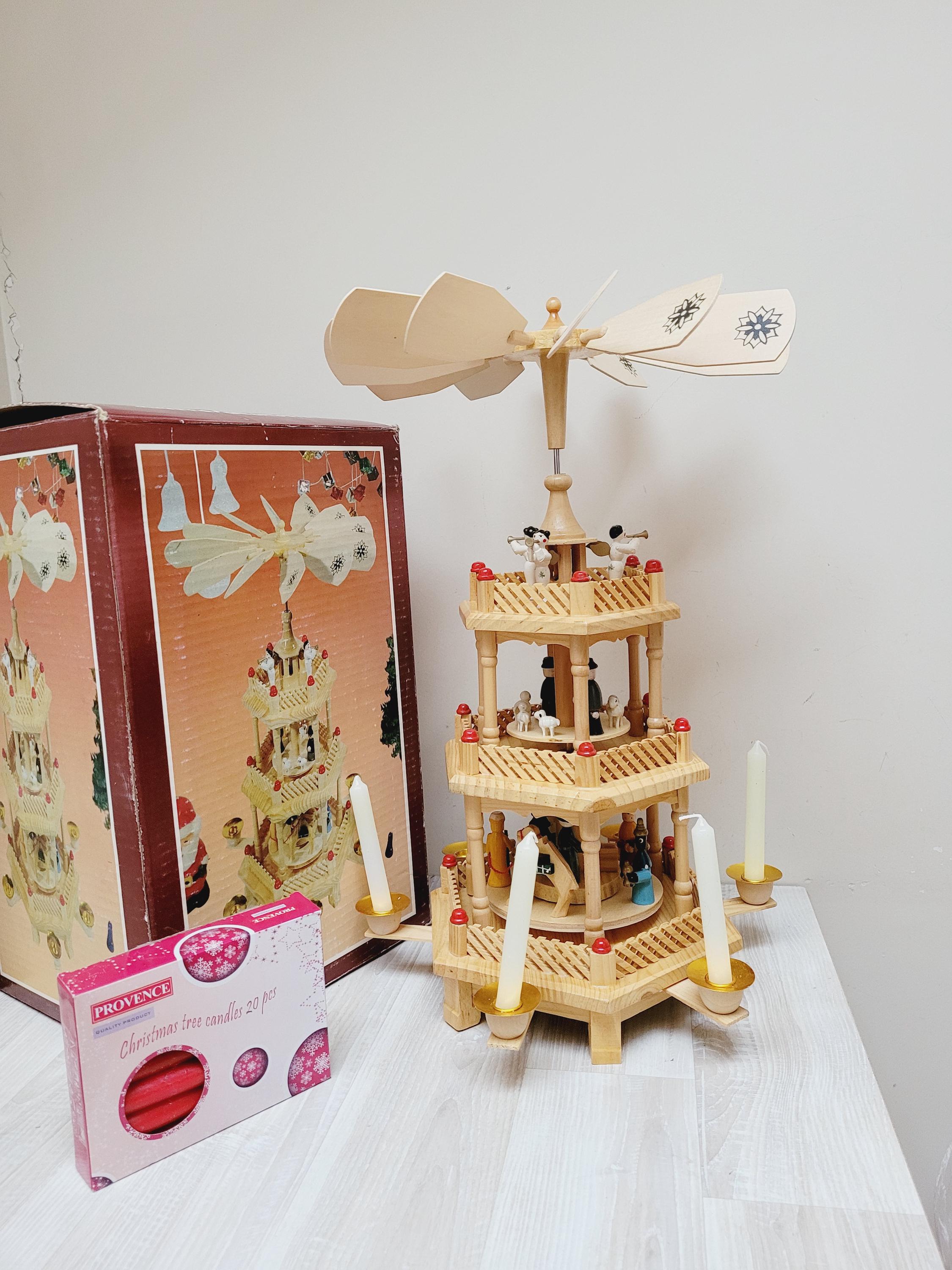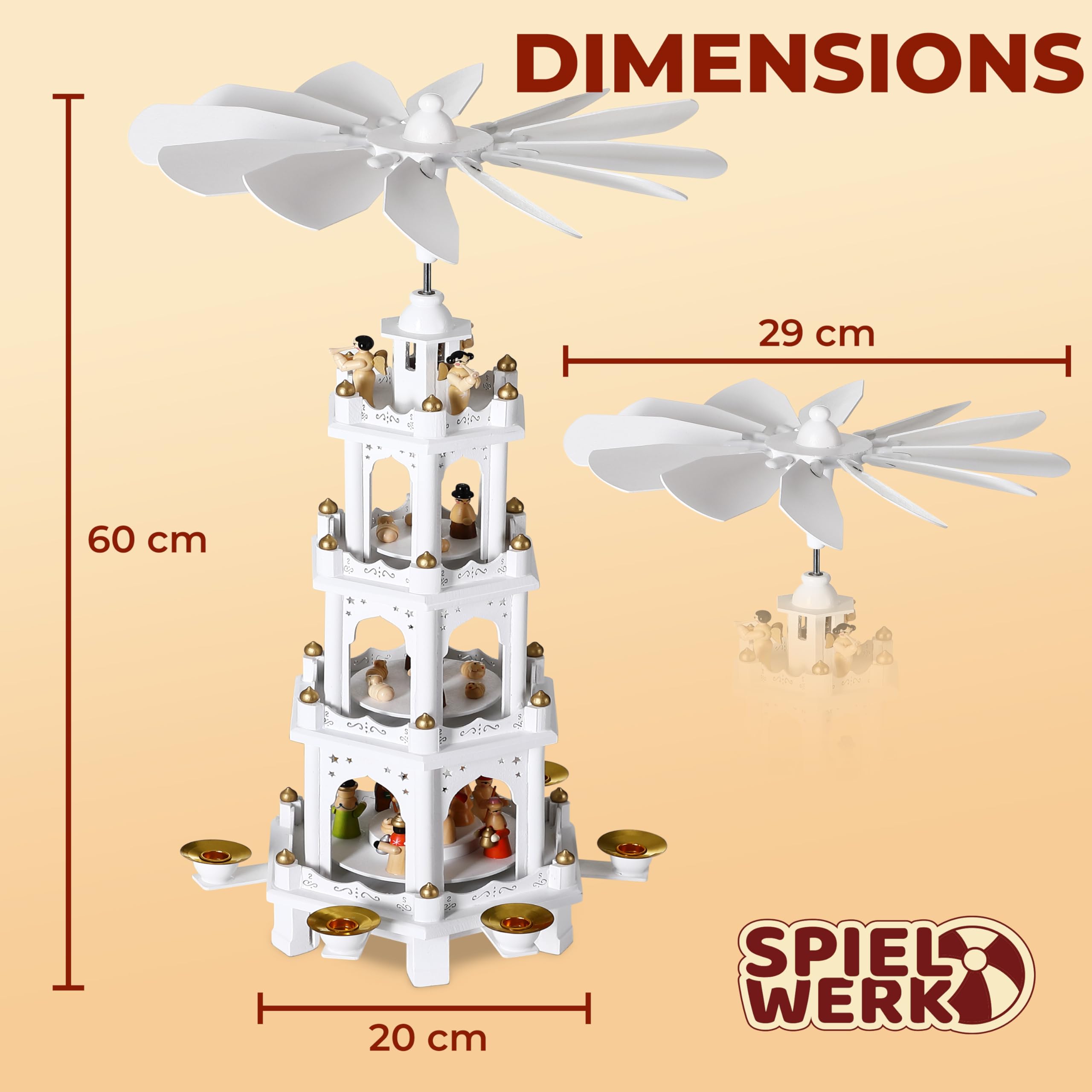 QUALITÉ : Pour accentuer cette ambiance festive, la pyramide est conçue en bois véritable. Les personnages peints à la main sont entraînés par les ailes du moulin à vent et dansent ensemble. Décoration Table Noël Traditionnelle Spielwerk Pyramide De Noël En Bois Véritable Blanc Peint à La Main 12 Hélices 6 Bougeoirs Décoratifs Figurines 4 étages Noël Personnage De Noël Fête Bougeoir Noël 6 Bougies Ambiance L'atmosphère féerique de Noël s'installe ! Cette pyramide bougeoir de l'Avent de 4 étages apporte un esprit deNoël supplémentaire dans votre décoration et... Une véritable ambiance de Noël ! Avantages du produit 3 étages Parfaite pour décorer une fenêtre ou une table , Peinte à la main CARACTÉRISTIQUES TECHNIQUES : Dimensions : (HxlxP) 35 cm x 20 cm x 20 cm - Ø Moulin à vent : 25 cm - Matériau : bois naturel - Couleur : multicolore - Pièces : 18 pièces - 3 étages Faites briller les yeux de vos enfants ! Bois véritable et naturel Les figurines représentent l'histoire de Noël et complètent cette magnifique décoration de Noël. Avec 6 chandeliers d´une épaisseur de 13 mm chacun , Moulin avec 10 ailes 4 étages - Contient 6 bougeoirs en aluminium : convient pour des bougies d'un diamètre max. de 1,25 cm - 12 hélices - Peint à la main Voir plus d'information Veuillez noter que les bougies ne sont pas incluses dans la livraison. L'AMOUR DES DÉTAILS : La pyramide est fabriquée en bois véritable. Ornée de figures typiques de Noël Pyramide Allemande 45,7 cm - Crèche de Noël en Bois - Sous le Sapin et Dessus de Table