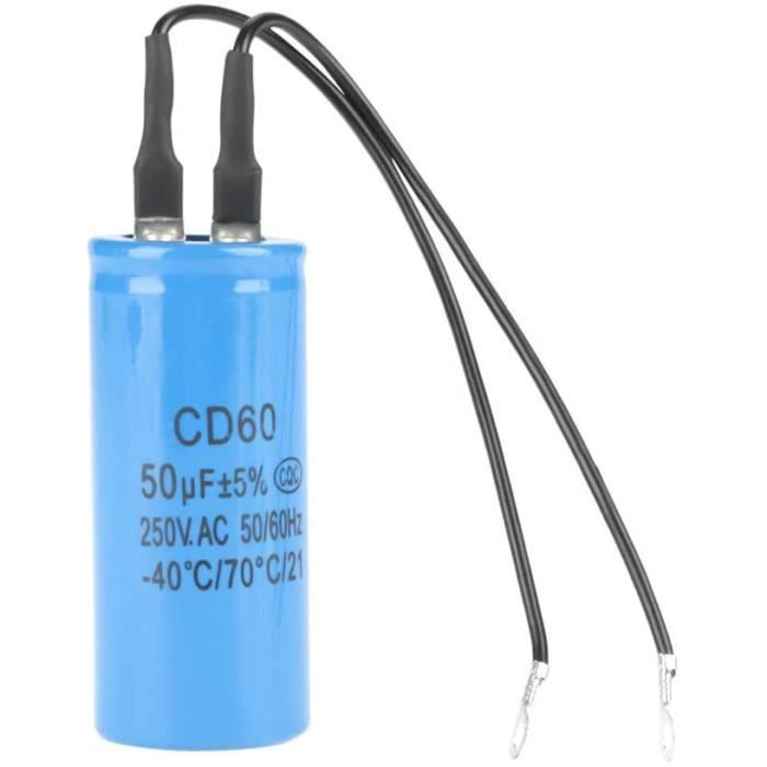 de démarrage et permanents pour moteurs électriques Avantages: Notre condensateur de démarrage moteur est compact, léger, de grande capacité, avec faible perte, bonne isolation, performance stable et longue durée... Condensateur Démarrage Moteur Moteur Démarrage Condensateur,150Uf 300V 50-60Hz Cd60 Fonctionnement Condensateur 250uf 300v Pour Climatiseur Notre condensateur de démarrage de moteur est un composant électronique utilisé en grande quantité dans les équipements électroniques et s'applique aux moteurs à courant alternatif 50 Hz et 60 Hz, tels que les compresseurs d'air, les nettoyeurs haute pression, les climatiseurs, les machines à laver, les moteurs, les générateurs, le HVAC, les ventilateurs, etc. Largement utilisé dans les climatiseurs, les moteurs de ventilateur de condenseur, les réfrigérateurs et autres moteurs électriques démarre,Instruction :La capacité est unitaire et peut être connectée librement, sans distinction entre positif et négatif. Le condensateur de fonctionnement CD60 est conçu pour le démarrage des moteurs à courant alternatif fonctionnant à une fréquence de 50 Hz et 60 Hz.Il est employé dans une multitude d'appareils tels que les compresseurs d'air, les nettoyeurs haute pression, les climatiseurs, les machines à laver, les moteurs, les générateurs, les... Spécification :Modèle : CD60Couleur de la coque : GrisMatériel : Coque en aluminiumExtrémité de câble : 1+1 insertCapacité : 250 ufTension nominale : 300 VTolérance : -10 % à +20 %Taille : 110 x 50 mm/ 4,33 x 1,97 pouces (L*W)Plage de température de fonctionnement : -40 ℃ à 65 ℃ /-40 ℉ à 149 ℉Liste de colisage : 1 pcs x condensateur de fonctionnement CD60Avantage :Notre condensateur de démarrage de moteur a une petite taille, un poids léger, une grande capacité, une faible perte, une bonne isolation, des performances stables et une longue durée de vie. Notre condensateur de démarrage de moteur est un composant électronique utilisé en grande quantité dans les équipements électroniques et applicable aux moteurs CA de 50 Hz et 60 Hz, tels que les compresseurs d'air, les nettoyeurs haute pression, les climatiseurs, les machines à laver, les moteurs, les générateurs, les systèmes de chauffage, de ventilation et de climatisation, les ventilateurs, etc. REMARQUE : Veuillez faire attention à ne pas dépasser le courant ou la tension maximale lors de l'utilisation. Avantage: Notre condensateur de démarrage de moteur est de petite taille, léger, de grande capacité, à faible perte, avec une bonne isolation, une performance stable et une longue durée de service.