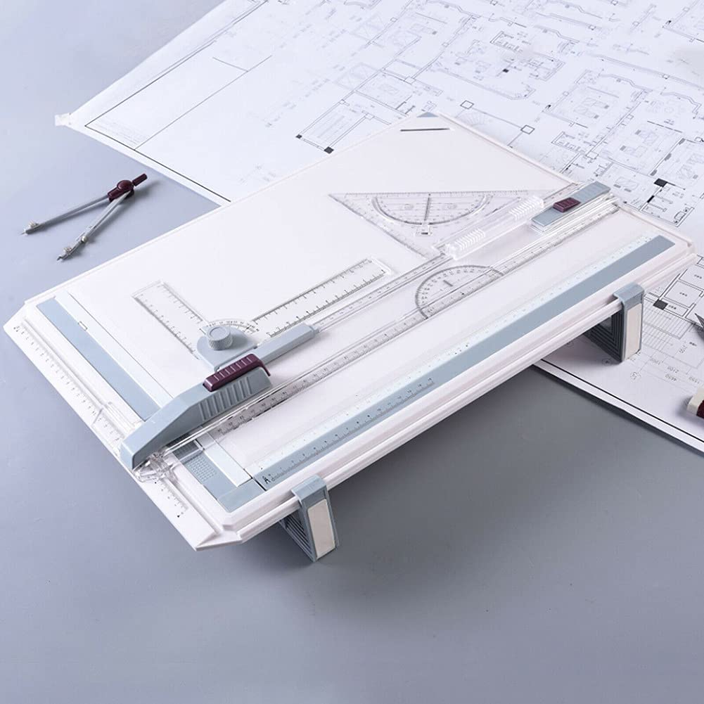 Dessin - Graphisme,Planche à dessin multifonction Double face pour Conçu avec des localisateurs de papier à dégagement rapide sur les deux bords de la planche à dessin pour la garder sûre et stable. Livré avec des pieds antidérapants, facile et confortable pour trouver un angle de dessin Planche à Dessin Parallèle Mesure VALINK Ensemble De Planche à Dessin Multifonction A3, Système De Mesure Réglable, Planche à Dessin à Mouvement Parallèle, Avec Rapporteur, Localisateur De Papier, Règle Coulissante Tablette Graphique Avec Rapporteur Caractéristiques : 1., Planche à dessin en plastique incassable pour une longue durabilité., 2., Grâce aux pieds antidérapants, un travail précis sur des surfaces lisses telles que l'acier ou le verre est possible., 3., Dossier A3 pour vos dessins, 0,6 m pour 2 angles d'inclinaison différents, règles d'angle, rail de dessin parallèle avec guide à 2 points pour un glissement fluide et un triangle 4., Deux clips de retenue magnétiques et un clip d'angle permettent de maintenir le dessin en toute sécurité et d'empêcher le dessin de glisser., 5., Il dispose d'une position de travail facile et confortable. Parfait pour créer des dessins professionnels et techniques dans les écoles ou le bureau. Il s'agit d'un poste de travail complet pour planche à dessin A3, conçu pour offrir une expérience de dessin professionnelle. Équipée d'un mouvement parallèle qui glisse dans une rainure, cette planche permet un réglage facile de l'angle et est dotée d'une règle coulissante transparente, d'un long guide, de poignées à dégagement... Contenu : 1 planche à dessin A3., Le jeu de planches à dessin A3 avec système métrique et la planche mesure 50,2 cm x 36,8 cm x 5 cm. La planche à dessin est fabriquée en matériau acrylique incassable pour plus de durabilité et la surface de dessin est très stable et solide pour tout projet de design. Idéal pour les étudiants, les ingénieurs, les artistes et les architectes. Le droit parallèle avec action de verrouillage/déverrouillage STOP and GO guide votre dessin avec précision.