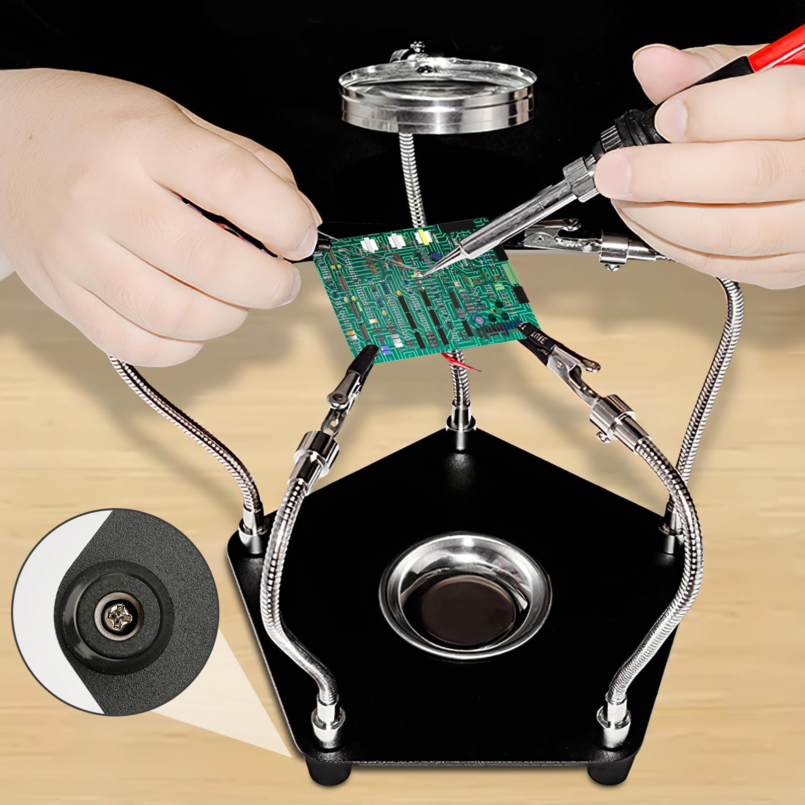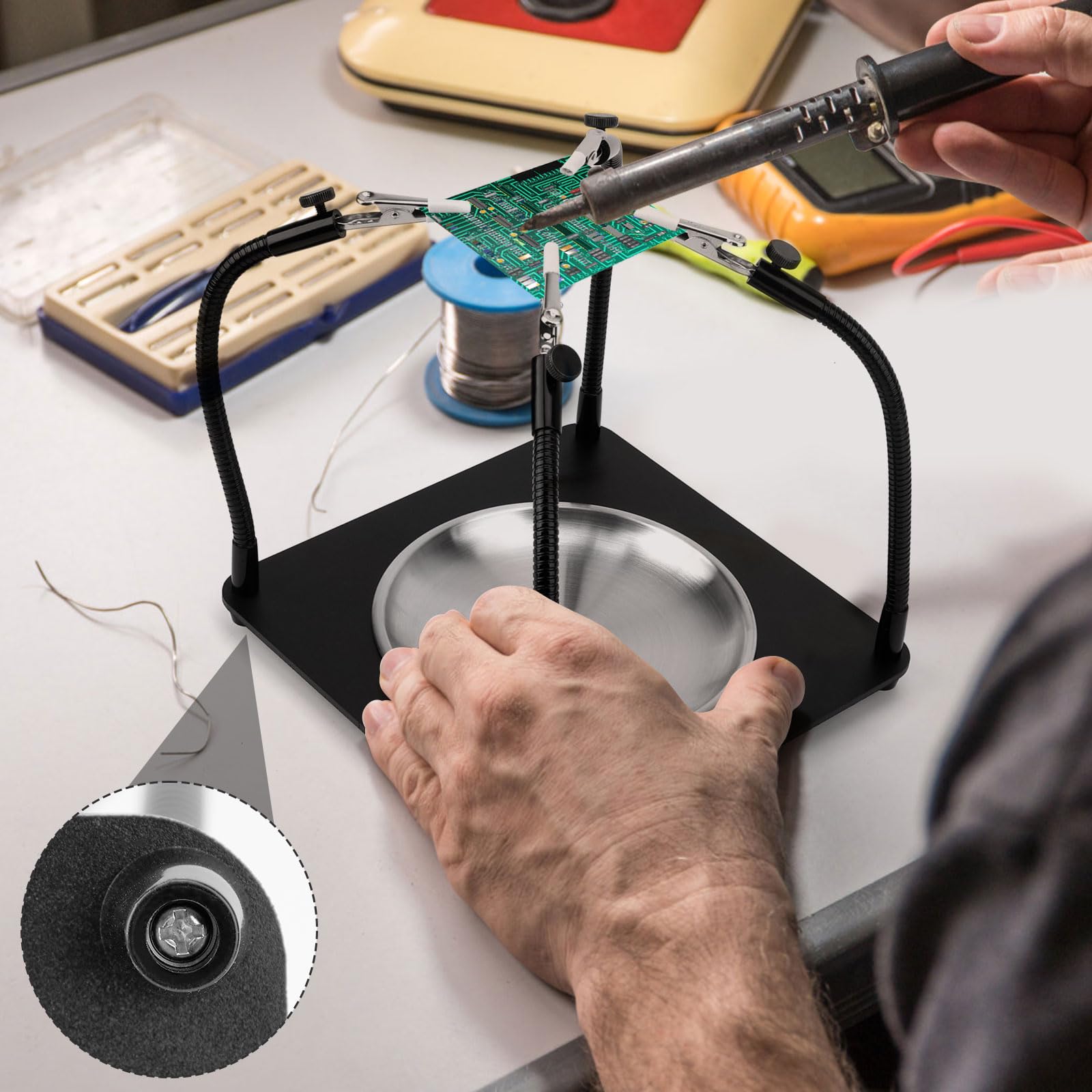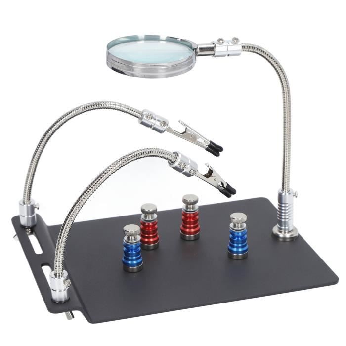 3eme Main Soudure Loupe Troisième Main Outil De Réparation De Soudure - Outillages & Appareils Station De Soudage Que vous soudiez des circuits imprimés ou que vous apportiez la touche finale à un modèle, vous pouvez facilement identifier les problèmes et assurer des réparations de qualité. Support Soudure Précision QWORK® Station De Soudage De Troisième Main Avec Loupe 3X Et 4 Bras Flexibles, Aide à La Soudure Pour L'électronique, Les Bijoux, L'artisanat Et Plus Encore Soudure Etain 【3eme Main Soudure avec 3X Lupe】La loupe avec optique acrylique offre un grossissement 3x pour voir clairement les minuscules composants, les soudures et autres détails. La station de soudure Troisième Main est un outil essentiel pour les passionnés de bricolage, offrant une assistance précieuse lors de la soudure, de la réparation et du modélisme. Équipée d'une loupe 3X avec éclairage LED, elle permet une vision claire et précise, facilitant ainsi les travaux minutieux 4 bras de soudure à la main ] Les 4 bras flexibles de l'outil à souder troisième main peuvent pivoter à 360 degrés pour un réglage facile de l'angle et ne... 【Stable Soudure Station de Soudage】La base en métal mat est extrêmement résistante à la chaleur et robuste ; elle dispose d'un plateau au centre de la base, très pratique pour manipuler les petites pièces ; en outre, la base est équipée d'un revêtement en caoutchouc antidérapant qui l'empêche de glisser pendant le soudage. 【4 Bras Flexible avec Pince Crocodile】Les 4 bras flexibles de l'outil de soudure troisième main peuvent être tournés à 360 degrés pour un réglage facile de l'angle et ne glissent pas facilement après le positionnement, laissant les deux mains libres pour les travaux de réparation. 【Facile à Installer】La troisième main d'aide est équipée de 1x bras métallique, 1x loupe, 4 x bras métalliques avec pinces crocodile, 1x compartiment de tri et 1x plaque de base, 5 x vis,5 x joint, 1x mini-tournevis. --La plaque de base a une excellente résistance à haute température, même sous de longues opérations de soudage à haute température peut maintenir la stabilité structurelle. Le bras est équipé de pinces crocodile avec une gaine en caoutchouc antidérapante pour s'assurer que les objets sont bien maintenus et que les circuits imprimés ne sont pas endommagés. Description du Produit: --L'aide au brasage de troisième main se compose d'un plateau, d'un établi, d'une loupe, d'un tournevis et d'autres outils nécessaires pour effectuer une multitude de réparations simples ou complexes.