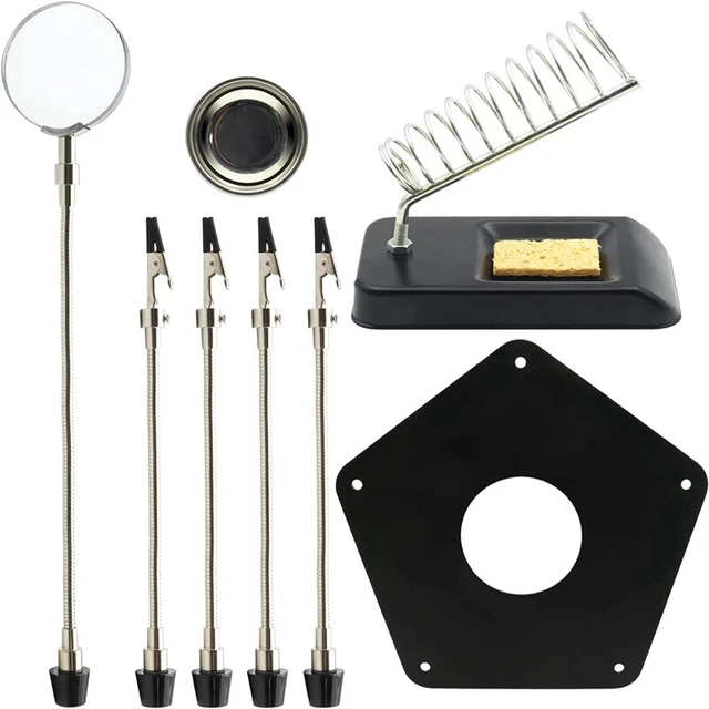 Poste a souder,Station de soudage avec 8 bras flexibles,support de Ils sont parfaitement adaptés pour les connexions temporaires lors de processus de soudure et de débogage précis. Station Soudure Aide Mains Troisième Main Outil De Soudure 6 Bras ... – Grandado 3eme Main Soudure Pinces crocodiles améliorées : avec des manchons en caoutchouc antidérapants, ils offrent non seulement un serrage sûr pour éviter les chutes, mais également protéger efficacement le circuit imprimé contre les dommages. Flexibilité multi-angle: Le support de carte PCB de réparation de soudage à bras flexibles 5Pc permet aux utilisateurs de positionner la zone de soudure à n'importe quel angle souhaité, assurant une soudure confortable et efficace Station de soudage avec loupe, troisièe ain, support de soudage... Kit professionnel : ce kit de soudure à troisième main intègre des outils essentiels tels qu'un plateau de rangement, un établi, une loupe et un tournevis, spécialement conçu pour les amateurs d'électronique, les techniciens d'entretien et le personnel de laboratoire. Même les débutants peuvent facilement identifier les problèmes, assurant la qualité de la réparation. Il répond à un large éventail de besoins, des réparations simples au dépannage complexe. Il maintient la stabilité structurelle même lors de longues tâches de soudure à haute température, prolongeant ainsi sa durée de vie. En outre, les coussinets en silicone sur la base empêchent le déplacement pendant l'utilisation, offrant un soutien stable pour vos travaux de réparation. Caractéristiques du produit : Matériau : acier, lentille optique acrylique.