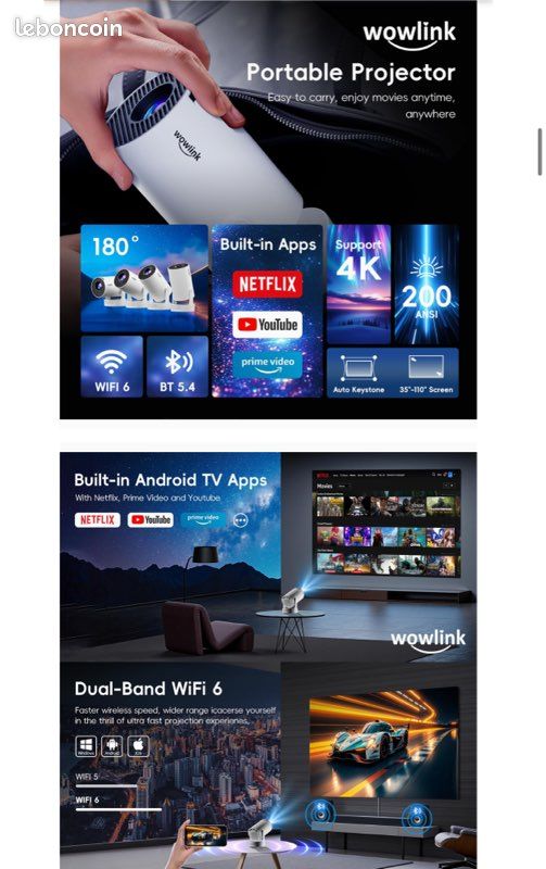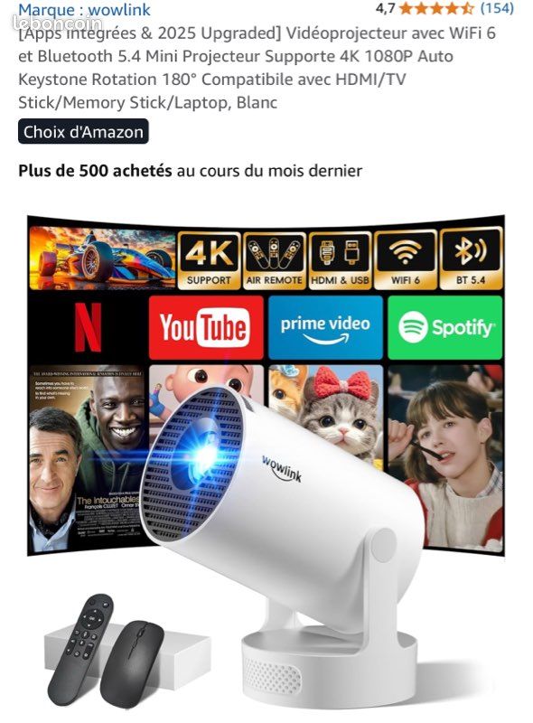 【Ratio de Projection Courte 0,9:1】Conçu pour les petits espaces, ce projecteur video à focale courte peut projeter une image impressionnante de 100 pouces à seulement 2,3 mètres du mur. Mini Vidéoprojecteur [App Intégrée & 2026 Upgraded Projecteur Supporte 4k 1080p Avec 5g Wifi 6 Et Bt 5 4 Soutien Rotation 270 Portable Projecteur Video Applicable Laptop Hdmi Tv Stick Home Bleu Compatible avec des tailles d’écran allant de 30 à 200 pouces, il offre une expérience visuelle optimale, quel que soit l’environnement. Retroprojecteur Portable Apps Intégrées & 2026 Upgraded] Vidéoprojecteur Avec WiFi 6 Et Bluetooth 5.4 Mini Projecteur Supporte 4K 1080P Auto Keystone Rotation 180° Compatibile Avec HDMI/TV Stick/Memory Stick/Laptop, Noir Vidéoprojecteur WiFi 6 Android 13 Il intègre également une technologie de protection oculaire, idéal pour regarder des films, jouer à des jeux vidéo ou profiter de projections nocturnes en extérieur. Contrairement aux retroprojecteur classiques qui nécessitent plus de 3 mètres pour une image de cette taille, celui-ci peut être posé sur une table basse ou une étagère. App Intégrée] Vidéoprojecteur avec WiFi 6 y BT 5.4,1080P Full HD Mini Projecteur Video, Projecteur Portable avec Autofocus et Correction Trapézoïdale Automatique,180° Rotation HDMI/TV Stick/USB Blan [Double Système de Contrôle et Projecteur Intelligent Intégré Aux Applications]Le projecteur portable est équipé d'un système innovant à double commande une télécommande... Son ventilateur ultra-silencieux (<30 dB) et sa molette de mise au point réglable assurent une projection sans distraction. Grâce au Bluetooth bidirectionnel 5., 4, la connexion sans fil est ultra-stable : un simple clic suffit pour connecter vos enceintes ou écouteurs Bluetooth. Vidéoprojecteur Portable avec Trépied VISULAPEX V3 Rétroprojecteur 5G... Profitez de mises à jour régulières et d’un système d’exploitation évolutif à vie pour une expérience toujours à jour et sécurisée., 【Bluetooth 5., 4 & Audio Haute Fidélité】Ce mini projecteur intègre des haut-parleurs stéréo HiFi et la technologie de décodage DTS pour une ambiance sonore digne du cinéma. Propulsé par la technologie WiFi 6 de dernière génération, il élimine les lenteurs et les interruptions typiques des anciens systèmes, améliorant la fluidité et la stabilité jusqu’à 60 %. La correction automatique du trapèze vertical ajuste instantanément les images déformées selon l’angle de projection. Grâce à la technologie LED de pointe, une luminosité de 200 lumens ANSI et un taux de contraste de 10000:1, il restitue 98% couleurs NTSC pour une précision cinématographique. 【Connectivité Multi-Appareils】Doté d’un port HDMI, d’un port USB et d’une prise casque 3,5 mm, ce video projecteur est compatible avec une large gamme d’appareils : souris, clé TV, ordinateur portable, smartphone Android/iOS, clé USB, appareil photo, console Switch/PS5, etc.