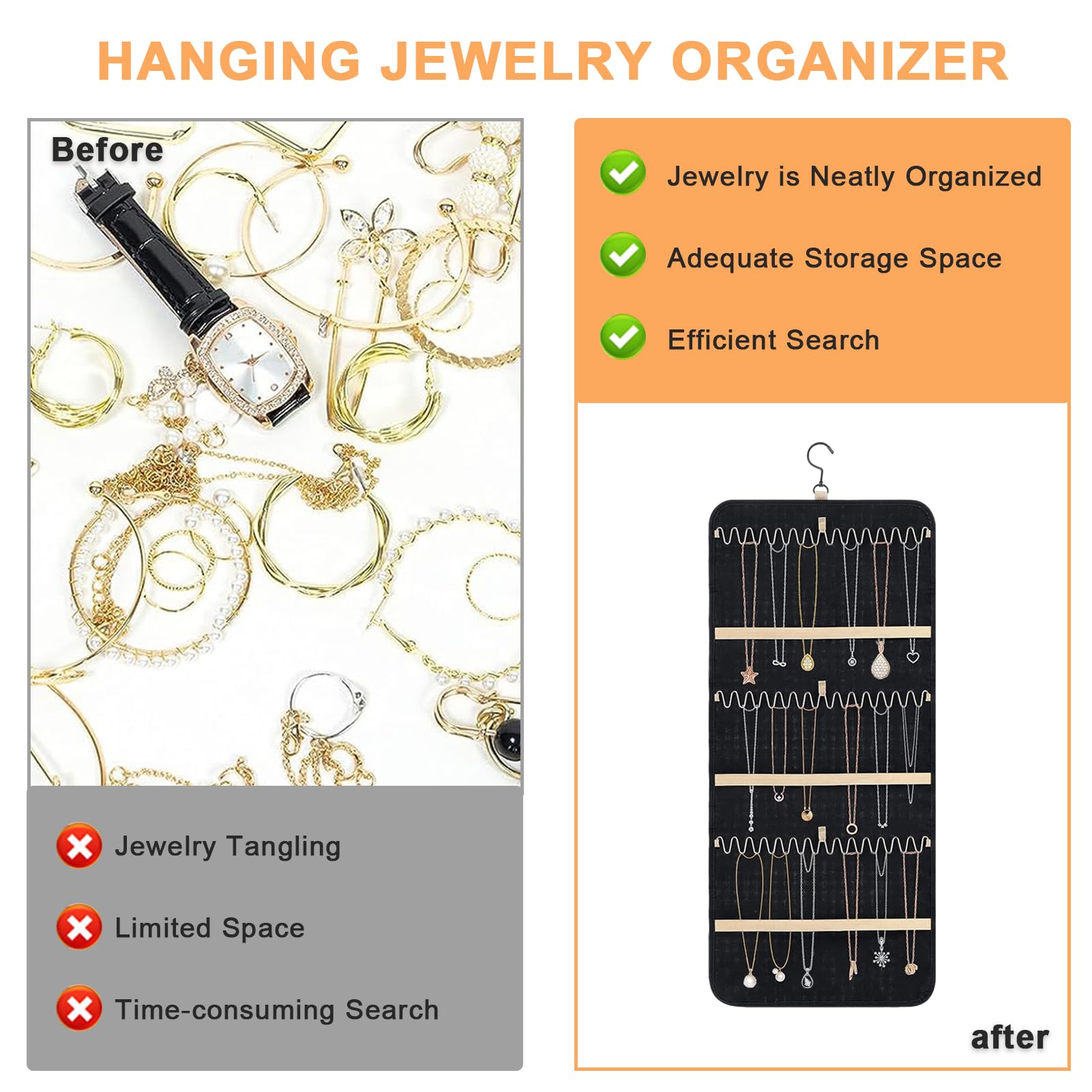 Double face et grande capacité : il y a trois types d'organiseurs de rangement de bijoux double face. - 40 petites poches pour bagues, boucles d'oreilles, broches, 8 grandes poches adaptées pour bracelets, montres, lunettes de soleil, etc., 8 cintres pour colliers et 2 sacs de rangement en velours pour vous aider à préparer et protéger les... Un côté est équipé de 48 poches transparentes, idéales pour ranger les bagues, les boucles d'oreilles et les bracelets ; l'autre côté est spécialement conçu pour 28 colliers, afin de garder vos bijoux bien rangés et ordonnés. Un côté est équipé de 48 poches transparentes, idéales pour... Porte-organisateur De Bijoux Suspendu, Sac De Rangement Pour Rangement à Bijoux Double Face - Organisateur De Bijoux à Suspendre - Porte- Bijoux Mural à Suspendre - Boucles D'oreilles - Colliers - Avec 48 Poches Et Crochets En Métal Ondulés